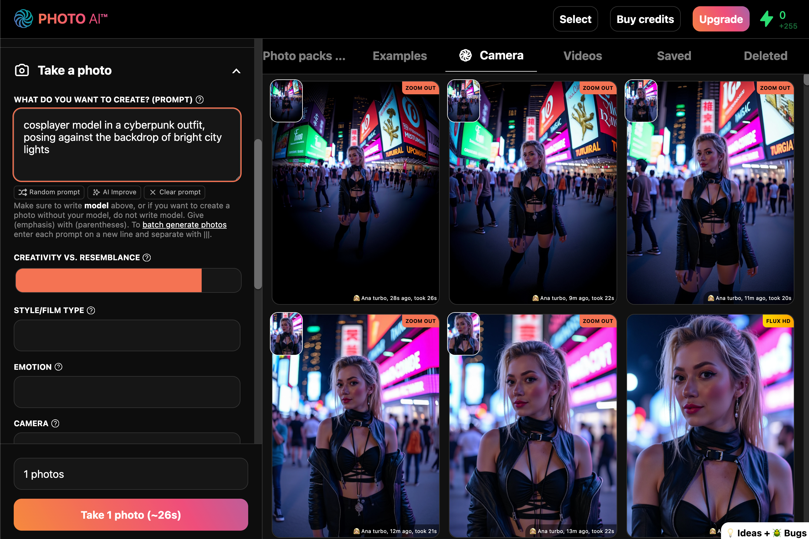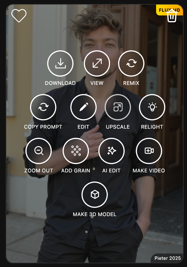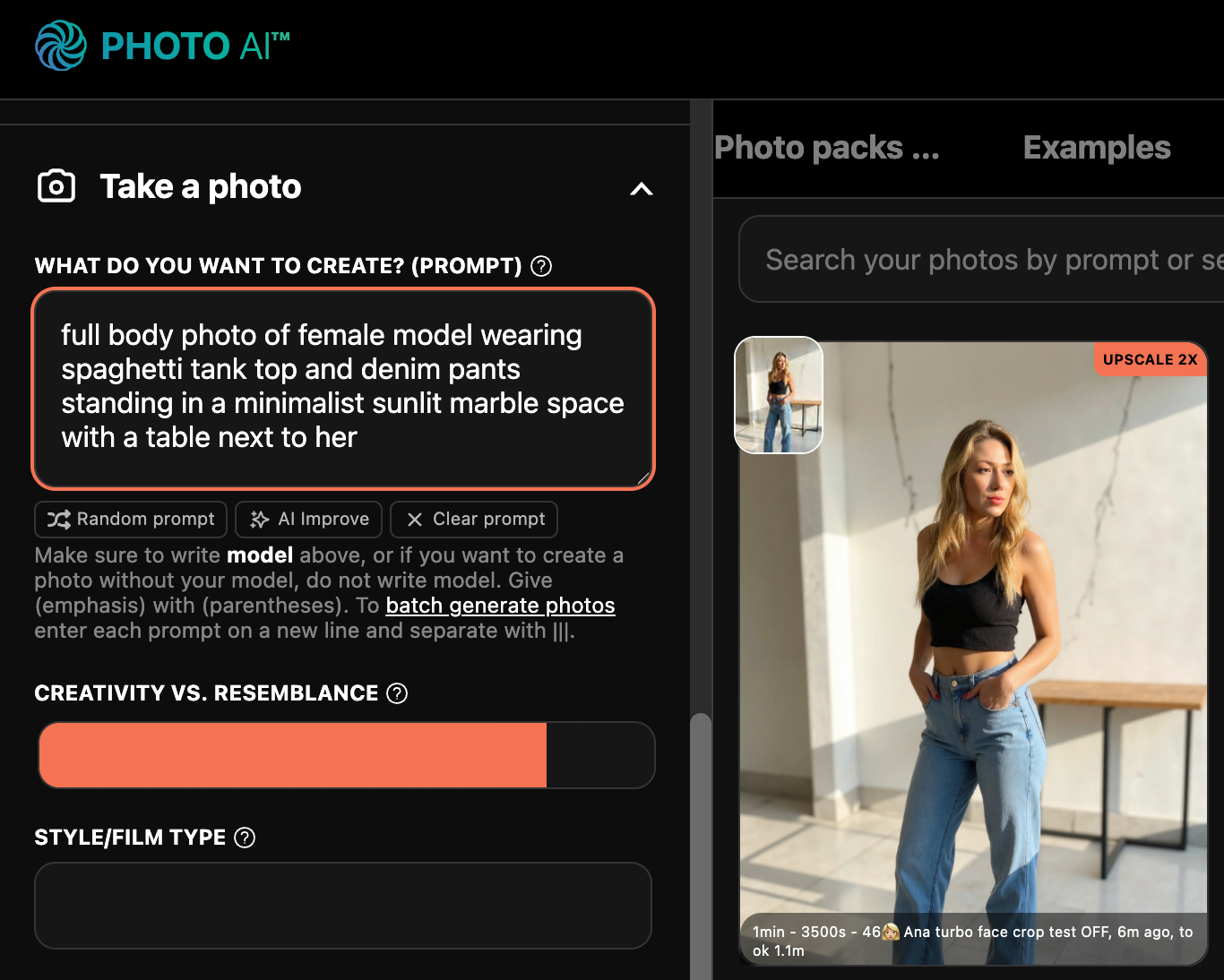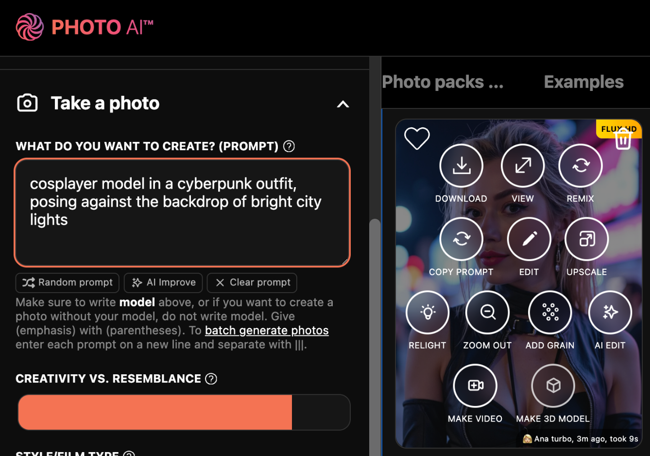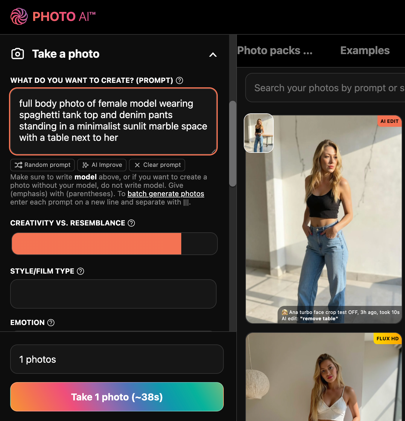 You can generate more at any time by writing your own prompt or running a photo pack — pre-made styles with curated lighting, outfits, and backgrounds: