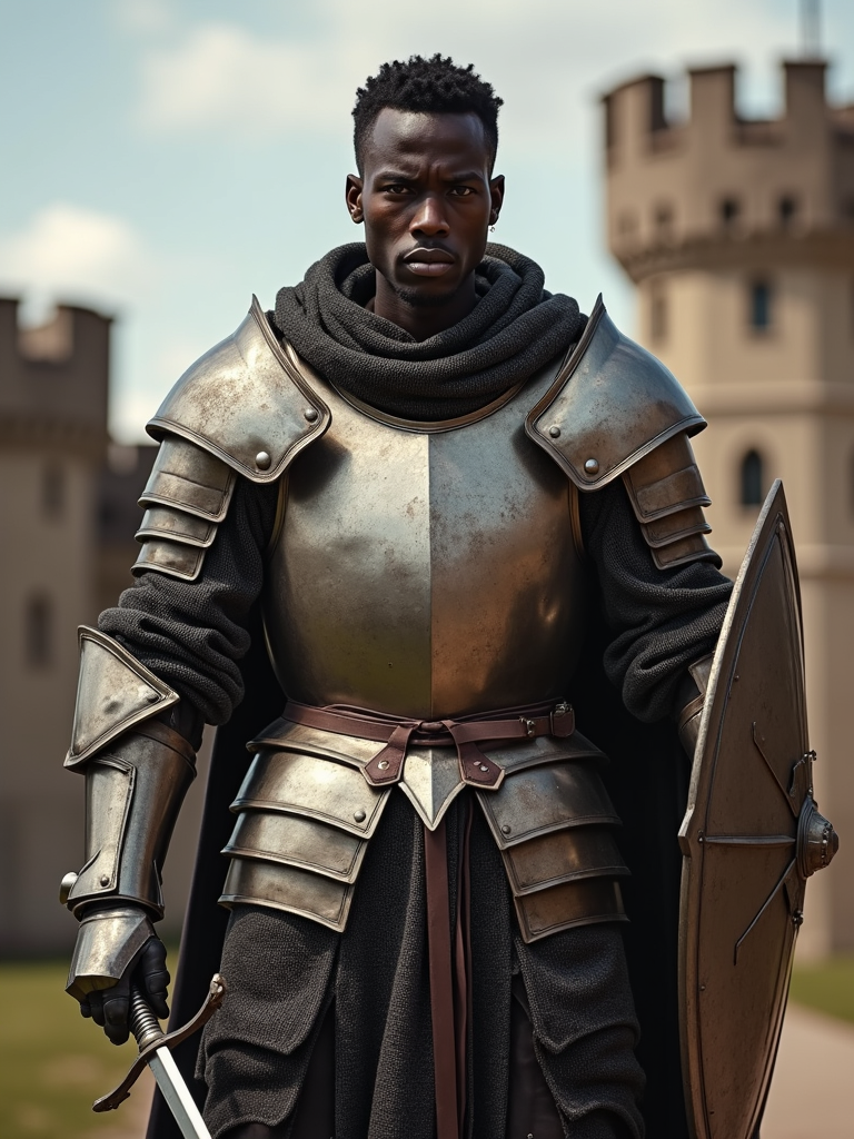 model as a historical character, castle backdrop, wearing a knight’s armor with a shield and sword, posing regally