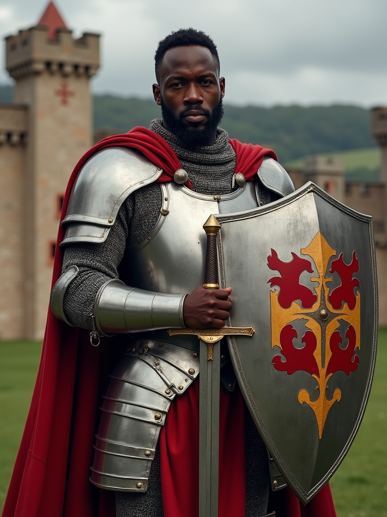 model as a historical character, castle backdrop, wearing a knight’s armor with a shield and sword, posing regally