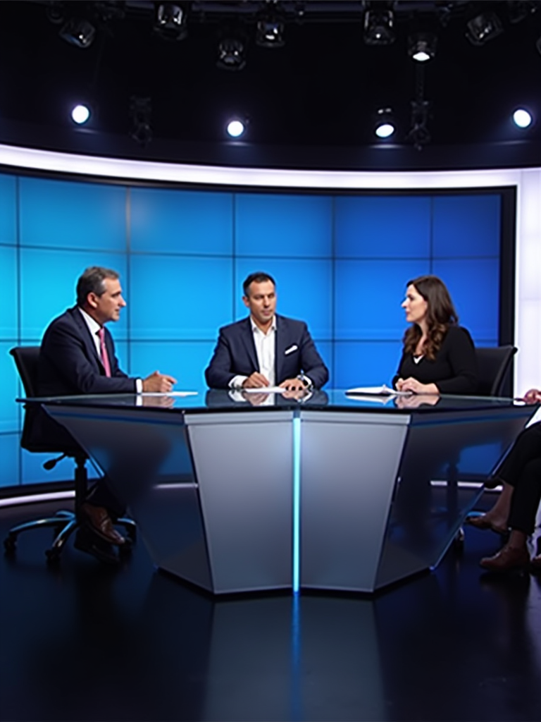a TV news channel panel discussion setup. three experts—one media ethics professor, a hollywood filmmaker, and a tech industry representative—are in a heated debate over the implications of ai-generated videos. the chyron reads: 'PhotoAI.com: innovation or threat?' the host asks, 'are ai-generated videos misleading the public?' the filmmaker warns, 'this technology could replace human actors entirely!' the tech industry rep defends ai, saying it 'enhances creativity, not replaces it.' the professor warns about deepfakes and ai propaganda.