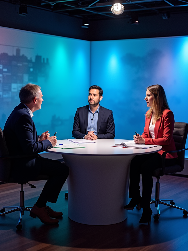 a TV news channel panel discussion setup. three experts—one media ethics professor, a hollywood filmmaker, and a tech industry representative—are in a heated debate over the implications of ai-generated videos. the chyron reads: 'PhotoAI.com: innovation or threat?' the host asks, 'are ai-generated videos misleading the public?' the filmmaker warns, 'this technology could replace human actors entirely!' the tech industry rep defends ai, saying it 'enhances creativity, not replaces it.' the professor warns about deepfakes and ai propaganda.