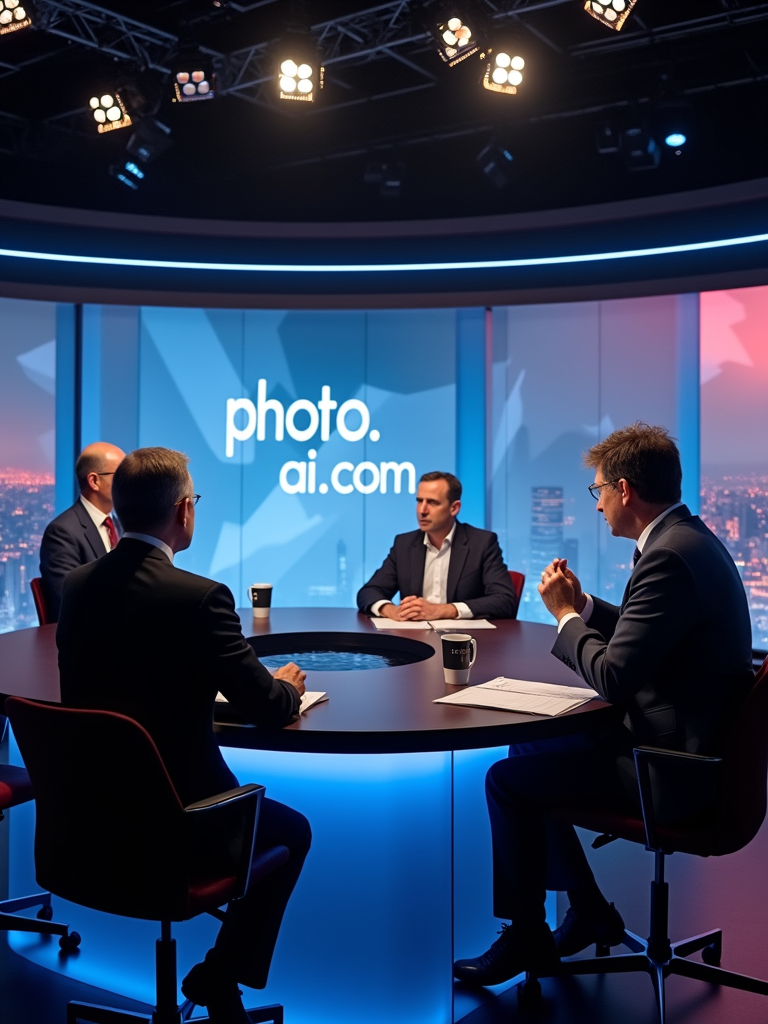 a TV news channel panel discussion setup. three experts—one media ethics professor, a hollywood filmmaker, and a tech industry representative—are in a heated debate over the implications of ai-generated videos. the chyron reads: 'PhotoAI.com: innovation or threat?' the host asks, 'are ai-generated videos misleading the public?' the filmmaker warns, 'this technology could replace human actors entirely!' the tech industry rep defends ai, saying it 'enhances creativity, not replaces it.' the professor warns about deepfakes and ai propaganda.