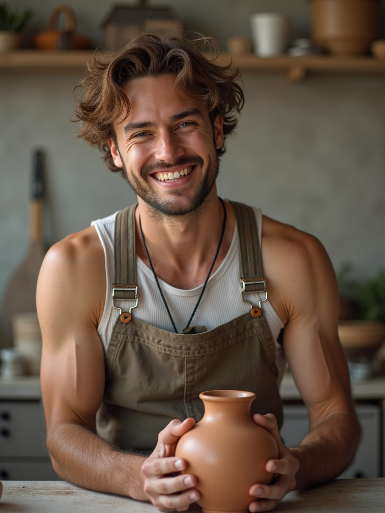 fun-loving masculine model trying out a new hobby—like rock climbing or pottery