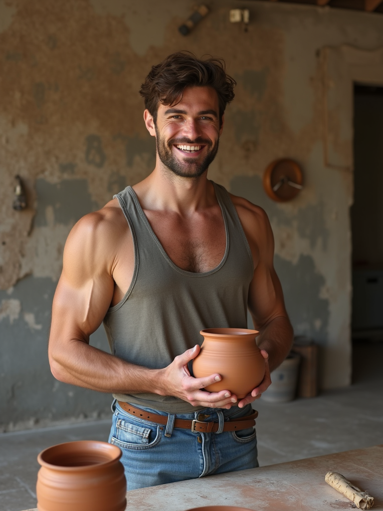 fun-loving masculine model trying out a new hobby—like rock climbing or pottery