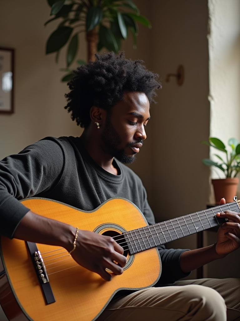 creative masculine model practicing a personal passion—playing guitar, painting, or crafting