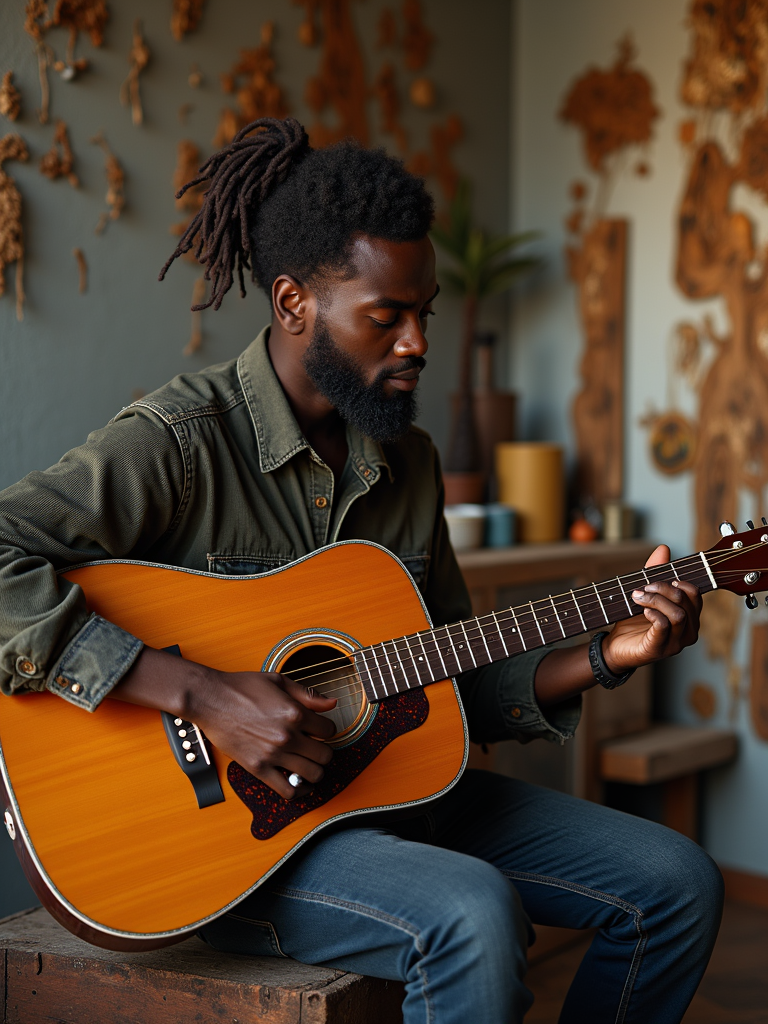 creative masculine model practicing a personal passion—playing guitar, painting, or crafting