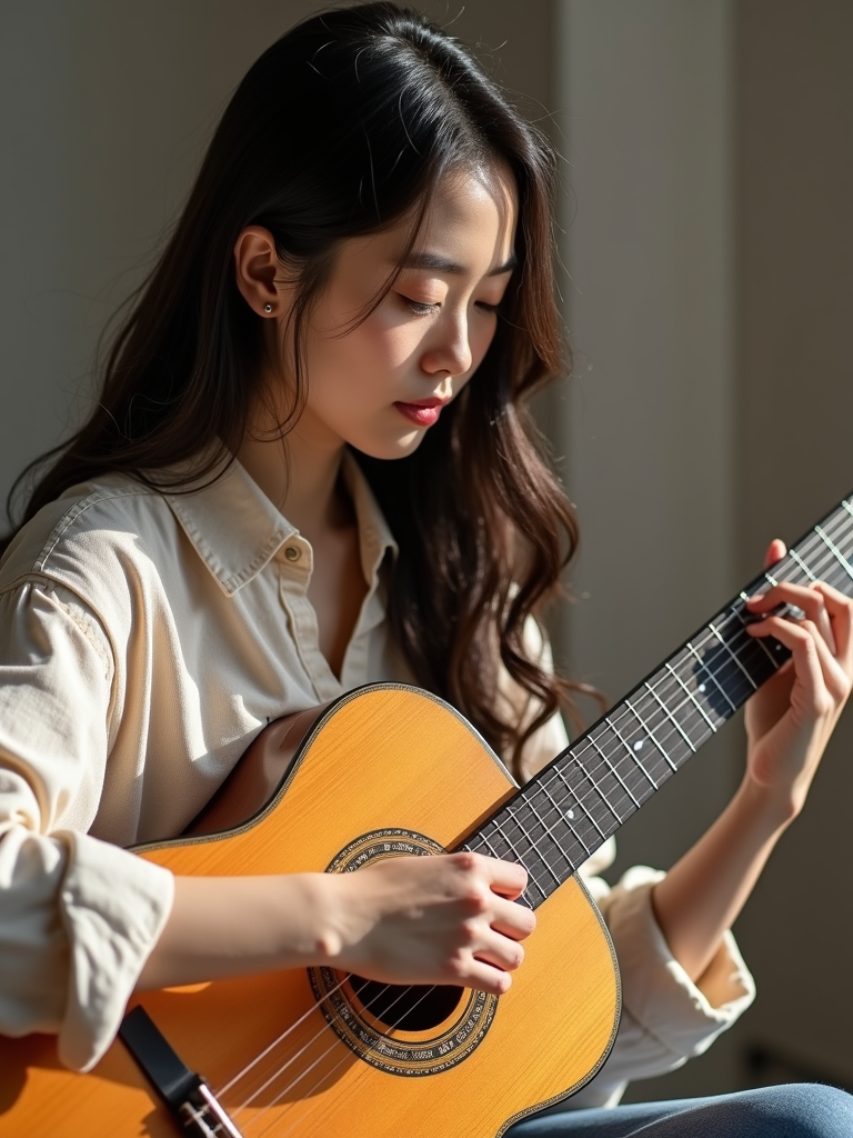 creative feminine model practicing a personal passion—playing guitar, painting, or crafting