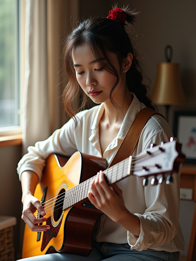 creative feminine model practicing a personal passion—playing guitar, painting, or crafting