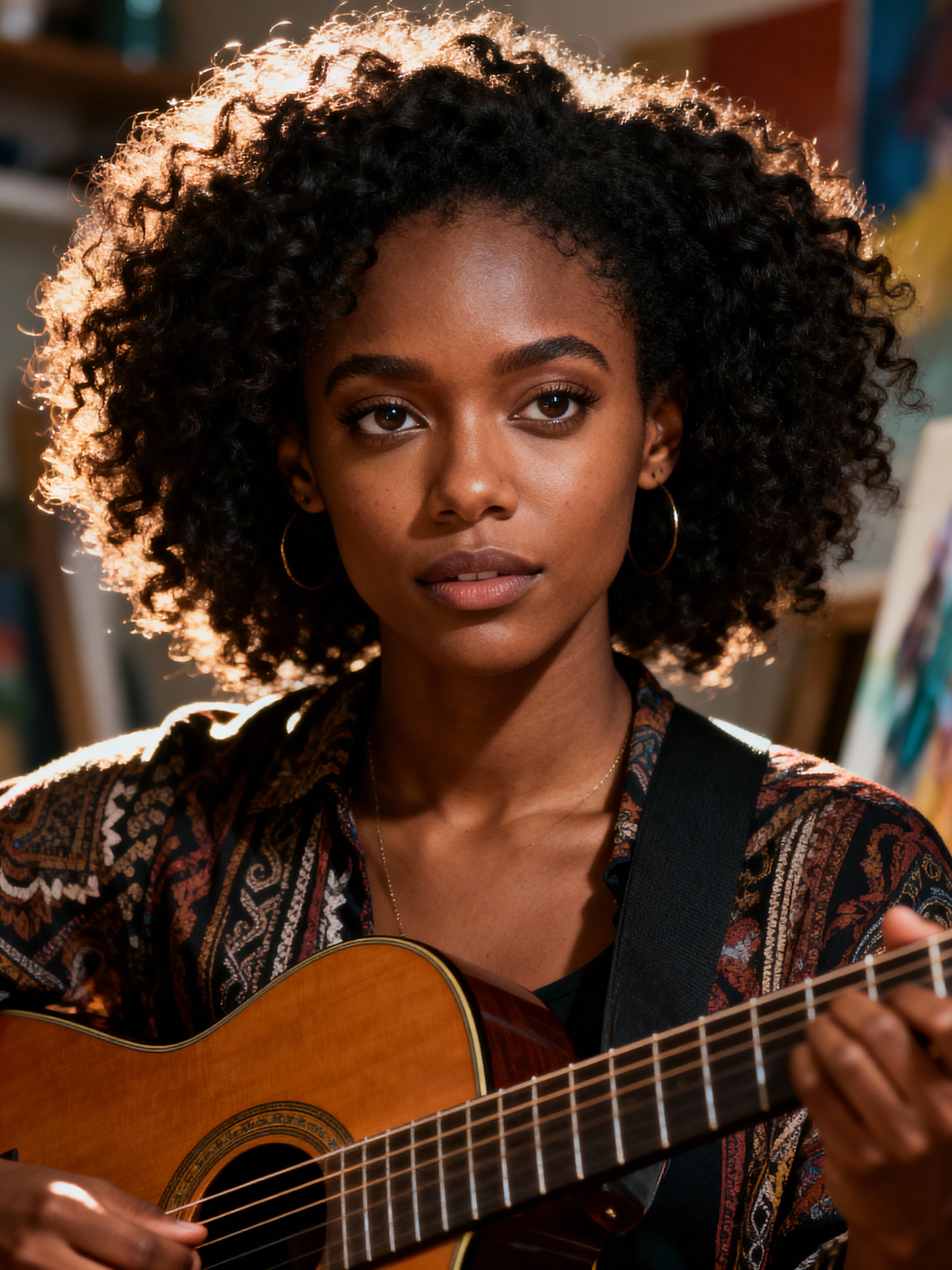 creative feminine model practicing a personal passion—playing guitar, painting, or crafting