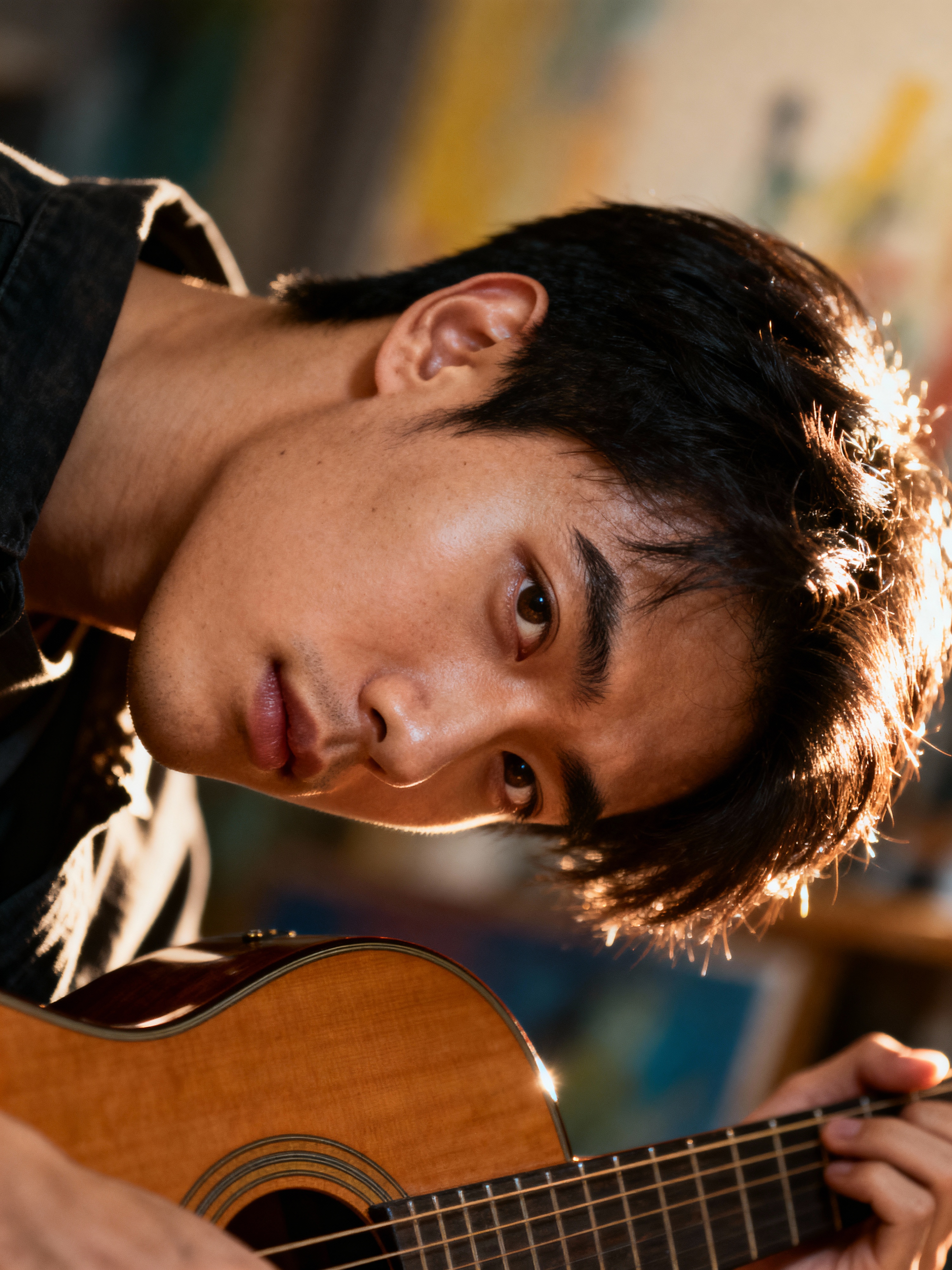 creative masculine model practicing a personal passion—playing guitar, painting, or crafting
