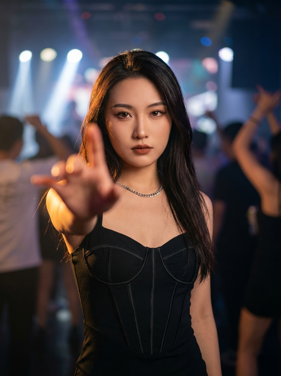 {"meta": {"title": "Nightclub Reach — Side Accent Lock", "intent": "Photorealistic nightlife fashion portrait with forced-perspective reach", "generation_mode": "style_locked_repeatable", "repeatability_target": "High (pose, lens, lighting, wardrobe locked)", "no_text_or_watermarks": true}, "format": {"aspect_ratio": "4:5", "orientation": "vertical", "resolution": "4096x5120", "detail": "ultra_high"}, "camera": {"type": "full_frame_digital", "lens": {"focal_length_mm": 28, "aperture_f": 2, "focus_distance_m": 0.55, "dof": "face sharp, hand slightly soft", "distortion": "natural wide-angle"}, "settings": {"shutter": "1/160", "iso": 800, "white_balance_k": 3400, "metering": "center-weighted on face"}, "framing": {"shot": "medium close-up with foreground hand", "camera_height_m": 1.55, "tilt": "+5 degrees", "crop": "head slight margin, cut at mid-thigh", "horizontal_bias": "52% right"}}, "subject": {"identity": {"age": "early 20s", "presentation": "model", "expression": "intense eye contact, confident calm"}, "hair": {"style": "sleek, lightly tousled", "length": "mid-back", "part": "center", "color": "deep brunette"}, "makeup": {"lashes": "long, thick, separated", "liner": "defined lower lash, thin upper line", "complexion": "natural texture, soft pearl cheek highlight", "lips": "neutral mauve satin"}, "accessories": {"necklace": "delicate silver chain at collarbone", "earrings": "none or tiny studs"}, "wardrobe": {"dress": {"type": "corset dress", "fit": "snug, structured bodice", "details": "panel seaming, subtle asymmetric fashion detail", "finish": "matte with light satin sheen"}}, "pose_lock": {"torso": "angled 15° camera-left", "shoulders": "slightly toward camera", "hand": {"action": "reaching toward lens", "frame_coverage": "25–35%", "fingers": "relaxed natural spread"}, "head": "chin slightly down, eyes up to lens"}}, "environment": {"location": "modern stylish nightclub", "time": "night", "crowd": {"density": "medium-high", "activity": "dancing", "faces": "soft and indistinct"}, "set": {"elements": ["light haze", "LED or neon accents", "dark reflective surfaces", "blurred bar lights"]}}, "lighting": {"key": {"type": "side accent", "direction": "camera-left", "quality": "soft directional", "temp_k": 3200, "intensity": "dominant"}, "fill": {"source": "ambient club light", "intensity": "low"}, "rim": "subtle cool rim for separation"}, "focus_motion": {"focus": "eyes", "background": "soft bokeh, slight dancer motion blur"}, "grade": {"look": "cinematic nightclub", "contrast": "moderate-high", "saturation": "controlled", "grain": "fine subtle film grain"}, "composition": {"priority": ["eyes", "lashes and liner", "foreground hand", "corset structure", "crowd and lights"], "rule": "forced perspective, eyes near upper third"}, "negative": {"exclude": ["illustration or cartoon", "text, logos, watermarks", "extra fingers or warped hands", "plastic skin", "extreme fisheye", "overexposure", "empty club"]}, "locks": {"pose": true, "lens": true, "lighting": true, "grade": true, "wardrobe": true, "environment": true}, "final_prompt": "Photorealistic 4:5 nightclub portrait of a young model centered, intense eye contact, reaching one hand toward the lens for forced perspective; fashion-forward corset dress; long lashes , defined lower liner, soft cheek highlight; delicate silver chain; modern club with dancing crowd, haze and bokeh; dominant warm side accent light from camera-left with minimal fill and faint cool rim; 28mm full-frame look, face sharp, hand slightly soft, cinematic grade, no text."}