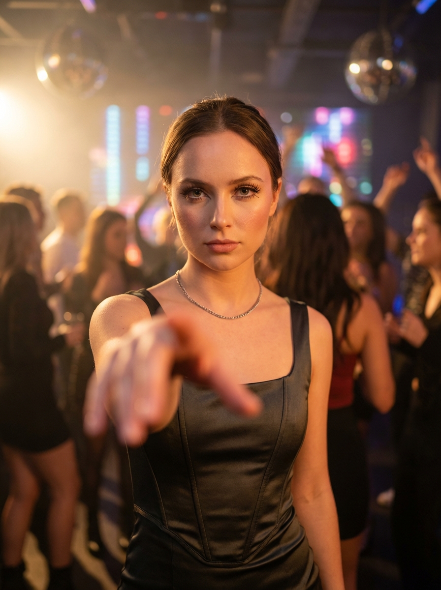 {"meta": {"title": "Nightclub Reach — Side Accent Lock", "intent": "Photorealistic nightlife fashion portrait with forced-perspective reach", "generation_mode": "style_locked_repeatable", "repeatability_target": "High (pose, lens, lighting, wardrobe locked)", "no_text_or_watermarks": true}, "format": {"aspect_ratio": "4:5", "orientation": "vertical", "resolution": "4096x5120", "detail": "ultra_high"}, "camera": {"type": "full_frame_digital", "lens": {"focal_length_mm": 28, "aperture_f": 2, "focus_distance_m": 0.55, "dof": "face sharp, hand slightly soft", "distortion": "natural wide-angle"}, "settings": {"shutter": "1/160", "iso": 800, "white_balance_k": 3400, "metering": "center-weighted on face"}, "framing": {"shot": "medium close-up with foreground hand", "camera_height_m": 1.55, "tilt": "+5 degrees", "crop": "head slight margin, cut at mid-thigh", "horizontal_bias": "52% right"}}, "subject": {"identity": {"age": "early 20s", "presentation": "model", "expression": "intense eye contact, confident calm"}, "hair": {"style": "sleek, lightly tousled", "length": "mid-back", "part": "center", "color": "deep brunette"}, "makeup": {"lashes": "long, thick, separated", "liner": "defined lower lash, thin upper line", "complexion": "natural texture, soft pearl cheek highlight", "lips": "neutral mauve satin"}, "accessories": {"necklace": "delicate silver chain at collarbone", "earrings": "none or tiny studs"}, "wardrobe": {"dress": {"type": "corset dress", "fit": "snug, structured bodice", "details": "panel seaming, subtle asymmetric fashion detail", "finish": "matte with light satin sheen"}}, "pose_lock": {"torso": "angled 15° camera-left", "shoulders": "slightly toward camera", "hand": {"action": "reaching toward lens", "frame_coverage": "25–35%", "fingers": "relaxed natural spread"}, "head": "chin slightly down, eyes up to lens"}}, "environment": {"location": "modern stylish nightclub", "time": "night", "crowd": {"density": "medium-high", "activity": "dancing", "faces": "soft and indistinct"}, "set": {"elements": ["light haze", "LED or neon accents", "dark reflective surfaces", "blurred bar lights"]}}, "lighting": {"key": {"type": "side accent", "direction": "camera-left", "quality": "soft directional", "temp_k": 3200, "intensity": "dominant"}, "fill": {"source": "ambient club light", "intensity": "low"}, "rim": "subtle cool rim for separation"}, "focus_motion": {"focus": "eyes", "background": "soft bokeh, slight dancer motion blur"}, "grade": {"look": "cinematic nightclub", "contrast": "moderate-high", "saturation": "controlled", "grain": "fine subtle film grain"}, "composition": {"priority": ["eyes", "lashes and liner", "foreground hand", "corset structure", "crowd and lights"], "rule": "forced perspective, eyes near upper third"}, "negative": {"exclude": ["illustration or cartoon", "text, logos, watermarks", "extra fingers or warped hands", "plastic skin", "extreme fisheye", "overexposure", "empty club"]}, "locks": {"pose": true, "lens": true, "lighting": true, "grade": true, "wardrobe": true, "environment": true}, "final_prompt": "Photorealistic 4:5 nightclub portrait of a young model centered, intense eye contact, reaching one hand toward the lens for forced perspective; fashion-forward corset dress; long lashes , defined lower liner, soft cheek highlight; delicate silver chain; modern club with dancing crowd, haze and bokeh; dominant warm side accent light from camera-left with minimal fill and faint cool rim; 28mm full-frame look, face sharp, hand slightly soft, cinematic grade, no text."}
