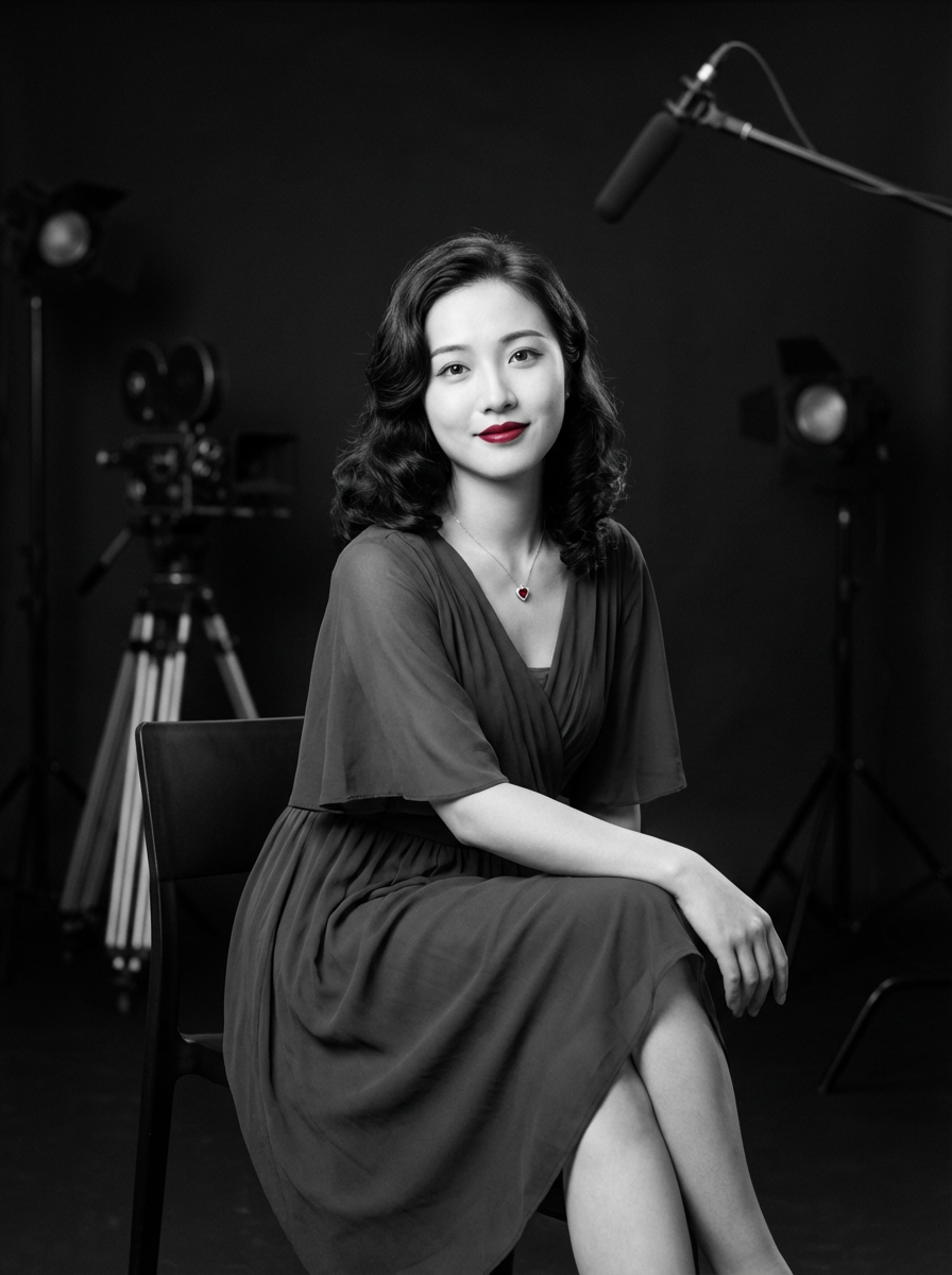 {"project": "Nano Banana – Iconic Hollywood Portrait", "version": "NB-ICON-1.3", "input_required": {"upload_person_image": false, "identity_mode": "Icon recreation", "identity_reference": "1950s Hollywood icon", "identity_consistency": "Mandatory across all outputs"}, "scene_meta": {"category": "Fine Art / Editorial Portrait", "aesthetic": ["Classic Hollywood", "Cinematic heritage", "Minimalist erotic elegance", "Museum-grade photography"], "narrative_density": "Focused", "brand_safety": {"explicit_content": "None", "modern_elements": "None", "logos_text": "None"}}, "frame": {"aspect_ratio": "4:5", "camera": {"sensor_format": "Full-frame", "lens": "85mm portrait prime", "aperture": "f/2.0", "focus": "Eyes and lips", "depth_of_field": "Shallow, cinematic isolation"}, "shot_type": "Seated medium-full body", "angle": "Slightly above eye level", "composition": {"subject_position": "Centered", "negative_space": "Dark background structured with symbolic silhouettes", "balance": "Symmetry gently broken by head tilt"}}, "environment": {"background": {"base_color": "Deep matte black", "visual_layer": {"type": "Silhouettes only", "elements": ["Vintage film camera", "Studio light stands", "Boom microphone", "Director’s chair", "Film reels"], "opacity": "Very subtle, low-contrast", "depth": "Layered at varying distances", "style": "Soft-edged silhouettes, no readable text or logos"}}, "furniture": {"chair": {"type": "Minimalist chair", "finish": "Matte", "role": "Subtle structural anchor"}}}, "subject": {"identity": {"gender": "model", "era": "1950s", "hair": {hair, "style": "Classic Hollywood waves ", "finish": "Soft studio sheen"}, "skin": {"tone": "Luminous porcelain", "detail": ["Fine pores", "Classic Hollywood retouch restraint"]}}, "pose": {"body_position": "Sitting on chair", "legs": "Crossed or gently parallel", "upper_body": "Leaning slightly forward", "posture": "Elegant, inviting, controlled", "hands": {"state": "Empty", "placement": "Resting naturally on lap or chair edge", "gesture_quality": "Relaxed, composed"}}, "head_and_gaze": {"head_tilt": "Slightly tilted to the left", "eye_direction": "Directly at the camera", "eye_quality": "Longing, soft intensity", "gaze_character": "Intimate, emotionally open"}, "expression": {"smile": "Charming, calm", "emotion": ["Tender confidence", "Quiet allure", "Emotional presence"]}}, "wardrobe": {"dress": {"type": "classic dress", "length": "Immediately below the knees", "style": "Timeless Hollywood elegance", "fabric": "Soft, flowing, light-catching", "contrast_function": "High contrast against background"}}, "accessories": {"necklace": {"material": "Silver", "pendant": {"shape": "Heart", "material": "Ruby", "size": "Small, delicate"}, "resting_position": "Centered at upper chest", "symbolism": ["Love", "Vulnerability", "Enduring allure"]}}, "makeup_details": {"lips": {"color": "Ruby red", "finish": "Soft satin", "precision": "Crisp contour , iconic shape"}}, "lighting": {"key_light": {"type": "Classic Hollywood soft key", "direction": "Front-side", "effect": "Sculpted cheekbones, luminous eyes, gentle lip highlights"}, "fill_light": {"type": "Minimal", "purpose": "Preserve shadow depth"}, "rim_light": {"type": "Subtle", "targets": ["Hair contour ", "Shoulders", "Dress edges", "Ruby heart pendant outline"]}, "shadow_style": "Soft film-noir shadows"}, "color_science": {"mode": "and photography", "contrast": "Medium-high, silver gelatin print feel", "grain": "Fine analog film grain", "selective_color": {"enabled": true, "target": "Lips only", "color": "Ruby red", "intensity": "Rich, jewel-like, controlled"}}, "nano_banana_rules": {"style_lock": "Classic Hollywood editorial", "identity_integrity": "Strict", "no_modernization": true, "avoid": ["Modern fashion", "HDR look", "Over-sharpening", "Caricature resemblance"]}, "output": {"resolution": "8K", "render_quality": "Ultra-high", "use_cases": ["Gallery fine art print", "Iconic editorial cover", "Luxury monochrome cinema tribute"]}}