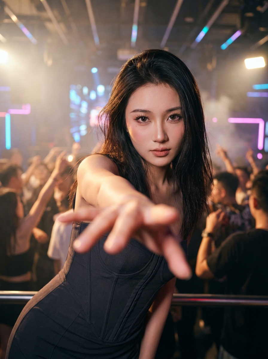 {"meta": {"title": "Nightclub Reach — Side Accent Lock", "intent": "Photorealistic nightlife fashion portrait with forced-perspective reach", "generation_mode": "style_locked_repeatable", "repeatability_target": "High (pose, lens, lighting, wardrobe locked)", "no_text_or_watermarks": true}, "format": {"aspect_ratio": "4:5", "orientation": "vertical", "resolution": "4096x5120", "detail": "ultra_high"}, "camera": {"type": "full_frame_digital", "lens": {"focal_length_mm": 28, "aperture_f": 2, "focus_distance_m": 0.55, "dof": "face sharp, hand slightly soft", "distortion": "natural wide-angle"}, "settings": {"shutter": "1/160", "iso": 800, "white_balance_k": 3400, "metering": "center-weighted on face"}, "framing": {"shot": "medium close-up with foreground hand", "camera_height_m": 1.55, "tilt": "+5 degrees", "crop": "head slight margin, cut at mid-thigh", "horizontal_bias": "52% right"}}, "subject": {"identity": {"age": "early 20s", "presentation": "model", "expression": "intense eye contact, confident calm"}, "hair": {"style": "sleek, lightly tousled", "length": "mid-back", "part": "center", "color": "deep brunette"}, "makeup": {"lashes": "long, thick, separated", "liner": "defined lower lash, thin upper line", "complexion": "natural texture, soft pearl cheek highlight", "lips": "neutral mauve satin"}, "accessories": {"necklace": "delicate silver chain at collarbone", "earrings": "none or tiny studs"}, "wardrobe": {"dress": {"type": "corset dress", "fit": "snug, structured bodice", "details": "panel seaming, subtle asymmetric fashion detail", "finish": "matte with light satin sheen"}}, "pose_lock": {"torso": "angled 15° camera-left", "shoulders": "slightly toward camera", "hand": {"action": "reaching toward lens", "frame_coverage": "25–35%", "fingers": "relaxed natural spread"}, "head": "chin slightly down, eyes up to lens"}}, "environment": {"location": "modern stylish nightclub", "time": "night", "crowd": {"density": "medium-high", "activity": "dancing", "faces": "soft and indistinct"}, "set": {"elements": ["light haze", "LED or neon accents", "dark reflective surfaces", "blurred bar lights"]}}, "lighting": {"key": {"type": "side accent", "direction": "camera-left", "quality": "soft directional", "temp_k": 3200, "intensity": "dominant"}, "fill": {"source": "ambient club light", "intensity": "low"}, "rim": "subtle cool rim for separation"}, "focus_motion": {"focus": "eyes", "background": "soft bokeh, slight dancer motion blur"}, "grade": {"look": "cinematic nightclub", "contrast": "moderate-high", "saturation": "controlled", "grain": "fine subtle film grain"}, "composition": {"priority": ["eyes", "lashes and liner", "foreground hand", "corset structure", "crowd and lights"], "rule": "forced perspective, eyes near upper third"}, "negative": {"exclude": ["illustration or cartoon", "text, logos, watermarks", "extra fingers or warped hands", "plastic skin", "extreme fisheye", "overexposure", "empty club"]}, "locks": {"pose": true, "lens": true, "lighting": true, "grade": true, "wardrobe": true, "environment": true}, "final_prompt": "Photorealistic 4:5 nightclub portrait of a young model centered, intense eye contact, reaching one hand toward the lens for forced perspective; fashion-forward corset dress; long lashes , defined lower liner, soft cheek highlight; delicate silver chain; modern club with dancing crowd, haze and bokeh; dominant warm side accent light from camera-left with minimal fill and faint cool rim; 28mm full-frame look, face sharp, hand slightly soft, cinematic grade, no text."}