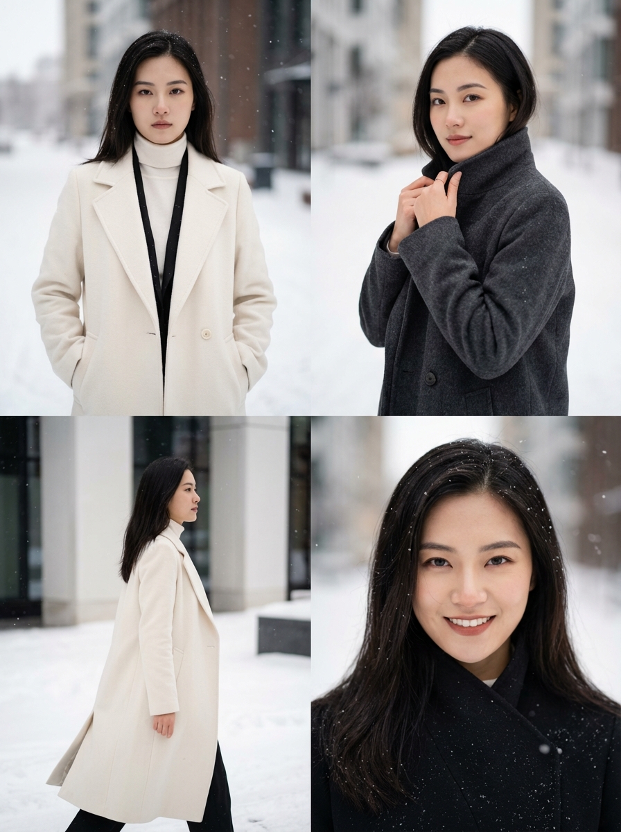 {"image_prompt": {"title": "Minimal Winter Muse – Instagram Fashion Collage", "layout": {"type": "2x2 Grid", "consistency": "Single new model, same winter palette, Instagram editorial flow"}, "subject_global": {"demographics": "young model, sharp features, modern look", "hair": "Loose soft waves, slightly wind-swept", "makeup": "Clean skin, soft blush , natural lips, defined brows", "expression_base": "Calm confidence, effortless elegance", "wardrobe": {"outerwear": "Long structured wool coat, ivory or charcoal tone, luxury tailoring", "inner_layer": "Fitted knit top or turtleneck, monochrome", "accessories": ["Leather gloves", "Minimal gold or silver jewelry", "Structured handbag "]}}, "environment_global": {"location": "Snowy urban street or modern wooden cabin exterior", "elements": ["Snow-covered ground", "Soft falling snow"], "lighting": "Soft natural daylight, Instagram-friendly brightness, no harsh shadows"}, "frames": [{"position": "Top Left", "theme": "POSE", "composition": {"shot_size": "Medium close-up", "angle": "Eye level", "depth": "Smooth background blur"}, "action": {"pose": "Hands in coat pockets, relaxed stance"}, "emotion": "Cool, composed", "atmosphere": "Light snowfall"}, {"position": "Top Right", "theme": "DETAIL", "composition": {"shot_size": "Medium close-up", "angle": "Slight side angle"}, "action": {"pose": "Adjusting coat collar"}, "emotion": "Soft confidence", "focus": "Fabric texture, clean styling"}, {"position": "Bottom Left", "theme": "WALK", "composition": {"shot_size": "Medium shot", "angle": "Side profile"}, "action": {"pose": "Walking through snow, coat flowing naturally"}, "emotion": "Effortless movement", "background_specifics": "Minimal architecture, snowy backdrop"}, {"position": "Bottom Right", "theme": "ICON", "composition": {"shot_size": "Tight medium close-up", "angle": "Straight-on"}, "action": {"pose": "Direct eye contact with camera"}, "emotion": "Strong, Instagram-icon presence", "details": "Sharp facial detail, soft snow particles"}], "technical_specs": {"camera": {"lens": "50–85 mm", "aperture": "f/2.0", "depth_of_field": "Clean bokeh, subject isolation"}, "textures": {"coat": "Premium wool texture", "skin": "Natural, realistic texture", "snow": "Fine, cinematic flakes"}, "style_modifiers": ["Instagram fashion editorial", "Minimal luxury winter", "Clean aesthetic portrait"], "color_grading": "Neutral winter tones, soft whites, muted blacks and greys"}}}