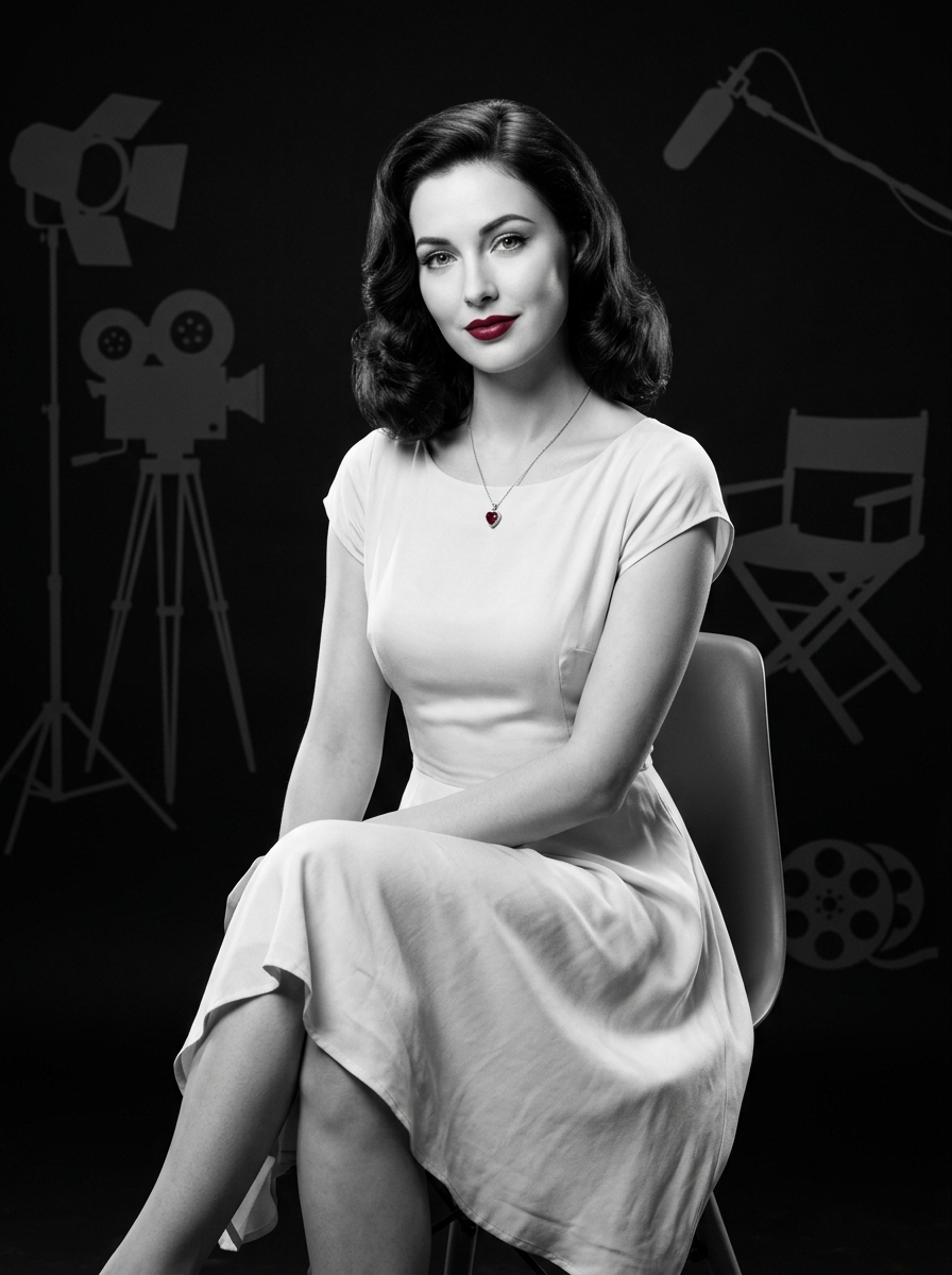 {"project": "Nano Banana – Iconic Hollywood Portrait", "version": "NB-ICON-1.3", "input_required": {"upload_person_image": false, "identity_mode": "Icon recreation", "identity_reference": "1950s Hollywood icon", "identity_consistency": "Mandatory across all outputs"}, "scene_meta": {"category": "Fine Art / Editorial Portrait", "aesthetic": ["Classic Hollywood", "Cinematic heritage", "Minimalist elegance", "Museum-grade photography"], "narrative_density": "Focused", "brand_safety": {"explicit_content": "None", "modern_elements": "None", "logos_text": "None"}}, "frame": {"aspect_ratio": "4:5", "camera": {"sensor_format": "Full-frame", "lens": "85mm portrait prime", "aperture": "f/2.0", "focus": "Eyes and lips", "depth_of_field": "Shallow, cinematic isolation"}, "shot_type": "Seated medium-full body", "angle": "Slightly above eye level", "composition": {"subject_position": "Centered", "negative_space": "Dark background structured with symbolic silhouettes", "balance": "Symmetry gently broken by head tilt"}}, "environment": {"background": {"base_color": "Deep matte black", "visual_layer": {"type": "Silhouettes only", "elements": ["Vintage film camera", "Studio light stands", "Boom microphone", "Director’s chair", "Film reels"], "opacity": "Very subtle, low-contrast", "depth": "Layered at varying distances", "style": "Soft-edged silhouettes, no readable text or logos"}}, "furniture": {"chair": {"type": "Minimalist chair", "finish": "Matte", "role": "Subtle structural anchor"}}}, "subject": {"identity": {"gender": "model", "era": "1950s", "hair": {hair, "style": "Classic Hollywood waves ", "finish": "Soft studio sheen"}, "skin": {"tone": "Luminous porcelain", "detail": ["Fine pores", "Classic Hollywood retouch restraint"]}}, "pose": {"body_position": "Sitting on chair", "legs": "Crossed or gently parallel", "upper_body": "Leaning slightly forward", "posture": "Elegant, inviting, controlled", "hands": {"state": "Empty", "placement": "Resting naturally on lap or chair edge", "gesture_quality": "Relaxed, composed"}}, "head_and_gaze": {"head_tilt": "Slightly tilted to the left", "eye_direction": "Directly at the camera", "eye_quality": "Longing, soft intensity", "gaze_character": " , emotionally open"}, "expression": {"smile": "Charming, calm", "emotion": ["Tender confidence", "Quiet allure", "Emotional presence"]}}, "wardrobe": {"dress": {"type": "classic dress", "length": "Immediately below the knees", "style": "Timeless Hollywood elegance", "fabric": "Soft, flowing, light-catching", "contrast_function": "High contrast against background"}}, "accessories": {"necklace": {"material": "Silver", "pendant": {"shape": "Heart", "material": "Ruby", "size": "Small, delicate"}, "resting_position": "Centered at upper chest", "symbolism": ["Love", "Vulnerability", "Enduring allure"]}}, "makeup_details": {"lips": {"color": "Ruby red", "finish": "Soft satin", "precision": "Crisp contour , iconic shape"}}, "lighting": {"key_light": {"type": "Classic Hollywood soft key", "direction": "Front-side", "effect": "Sculpted cheekbones, luminous eyes, gentle lip highlights"}, "fill_light": {"type": "Minimal", "purpose": "Preserve shadow depth"}, "rim_light": {"type": "Subtle", "targets": ["Hair contour ", "Shoulders", "Dress edges", "Ruby heart pendant outline"]}, "shadow_style": "Soft film-noir shadows"}, "color_science": {"mode": "and photography", "contrast": "Medium-high, silver gelatin print feel", "grain": "Fine analog film grain", "selective_color": {"enabled": true, "target": "Lips only", "color": "Ruby red", "intensity": "Rich, jewel-like, controlled"}}, "nano_banana_rules": {"style_lock": "Classic Hollywood editorial", "identity_integrity": "Strict", "no_modernization": true, "avoid": ["Modern fashion", "HDR look", "Over-sharpening", "Caricature resemblance"]}, "output": {"resolution": "8K", "render_quality": "Ultra-high", "use_cases": ["Gallery fine art print", "Iconic editorial cover", "Luxury monochrome cinema tribute"]}}