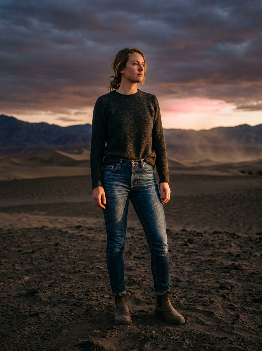 1. Model in fitted blue jeans highlighting dramatic texture and sharp denim details standing in vast moody desert at dusky sunset, subtle orange-pink glow contrasting dark sands, high contrast lighting, cinematic wide-angle shot, dusty atmosphere, intense mood, hyper-detailed fabric, golden hour rim light, photorealistic fashion portrait, 8k.