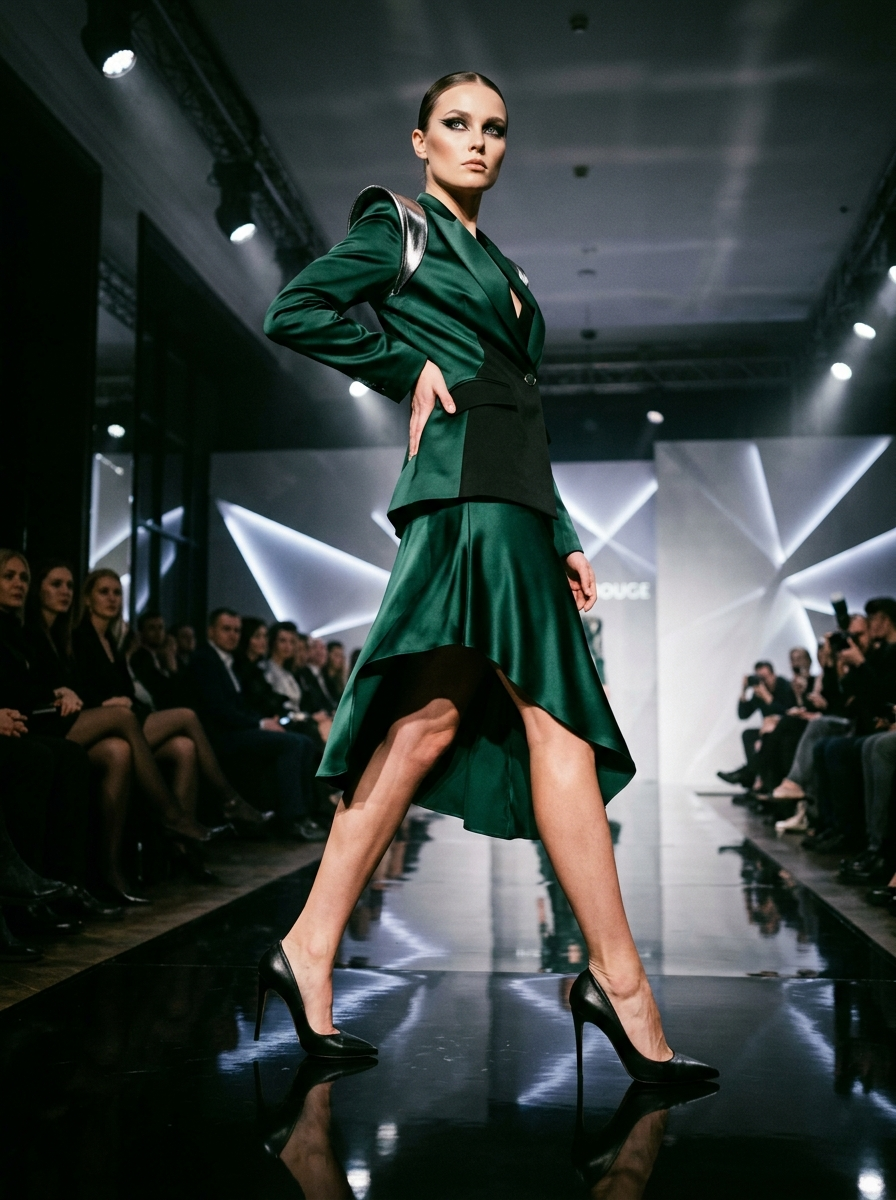 11. Model striding powerfully in sky-high heels on glossy runway, elegant high-fashion editorial for Au Pont Rouge, dramatic studio lighting with sharp shadows, low wide-angle shot, luxurious confident mood, satin fabrics and metallic accents, vogue-style pose, flawless legs emphasis, hyper-detailed, 8k.