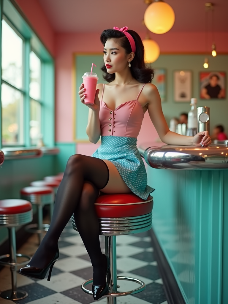 1950s pin-up model sitting on a chrome diner stool, wearing a blue polka dot short flared skirt with black thigh high stockings, high heels, pink headband, vintage hairstyle, holding a pink milkshake, classic American diner background with checkered tiles and retro decor, flirty expression