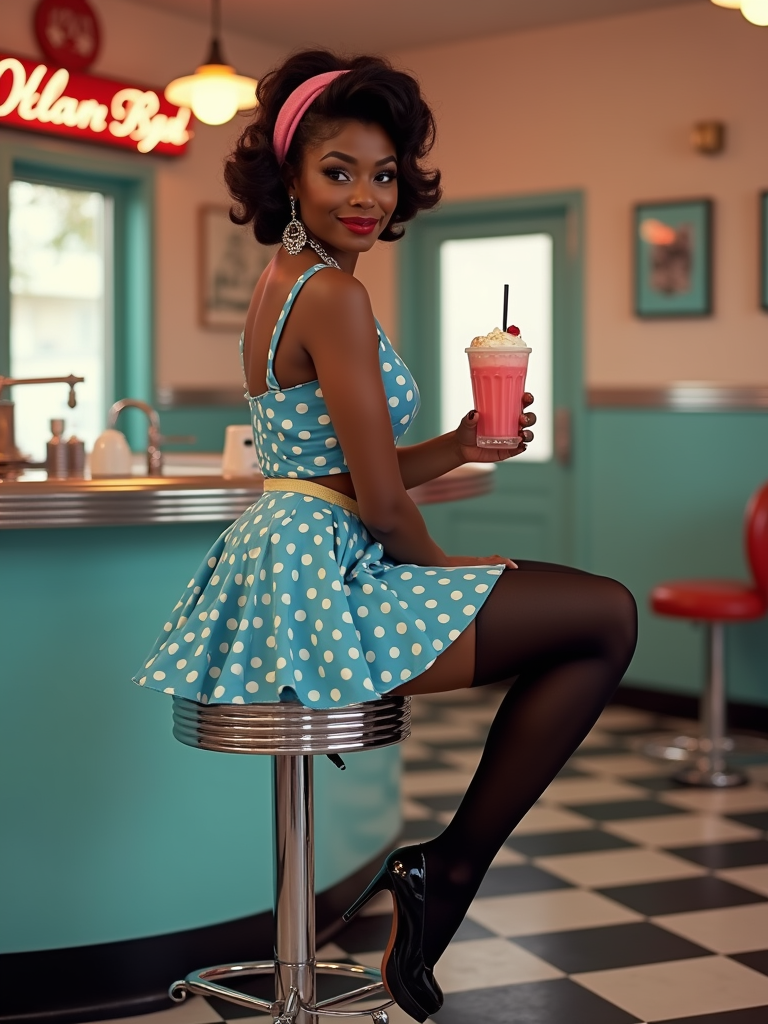 1950s pin-up model sitting on a chrome diner stool, wearing a blue polka dot short flared skirt with black thigh high stockings, high heels, pink headband, vintage hairstyle, holding a pink milkshake, classic American diner background with checkered tiles and retro decor, flirty expression