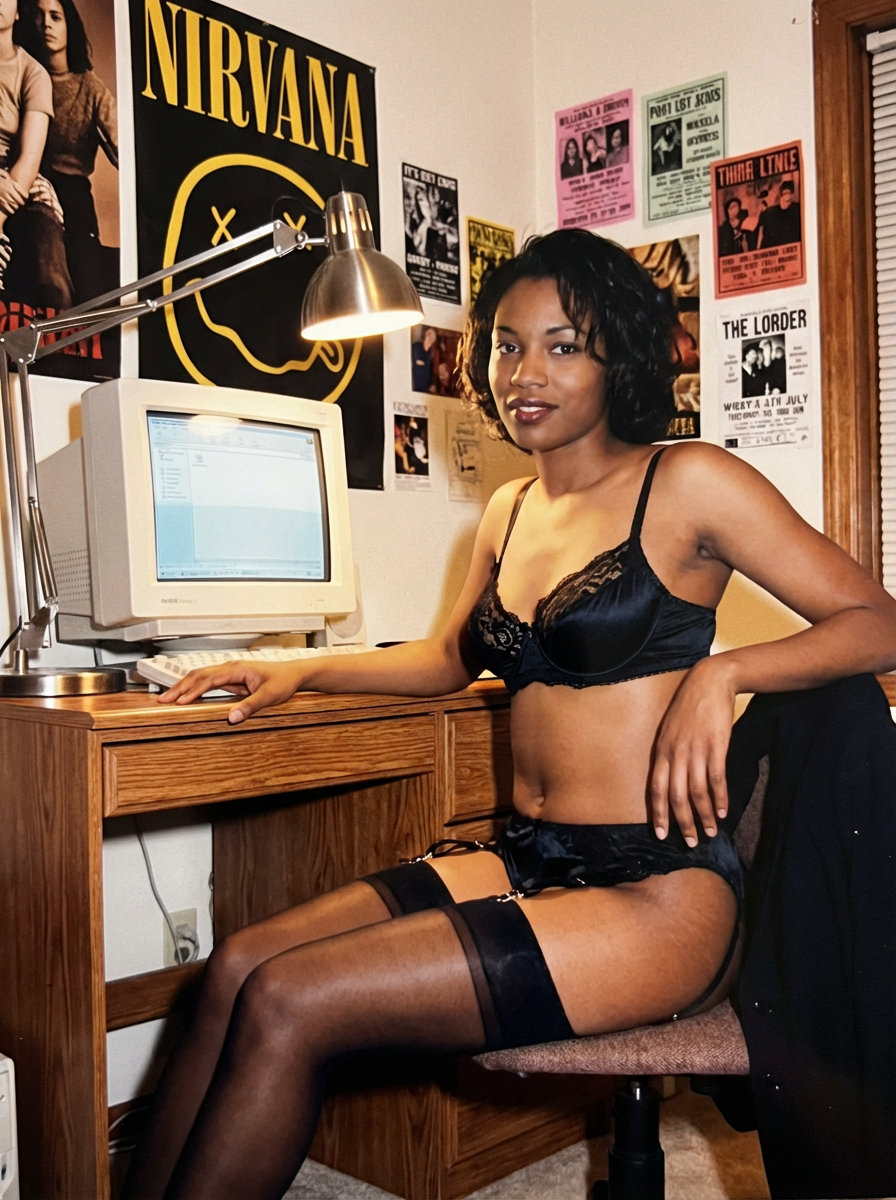 1990s photo of a seductive model sits at a bedroom desk setup, dressed in elegant black silk lingerie, including a matching silk bra and thigh-high stockings held up by garters. Large posters are pinned to the wall above the desk. A beige 1990s personal computer on the desk. An adjustable desk lamp illuminates the workspace, and colorful posters and flyers decorate the surrounding walls.