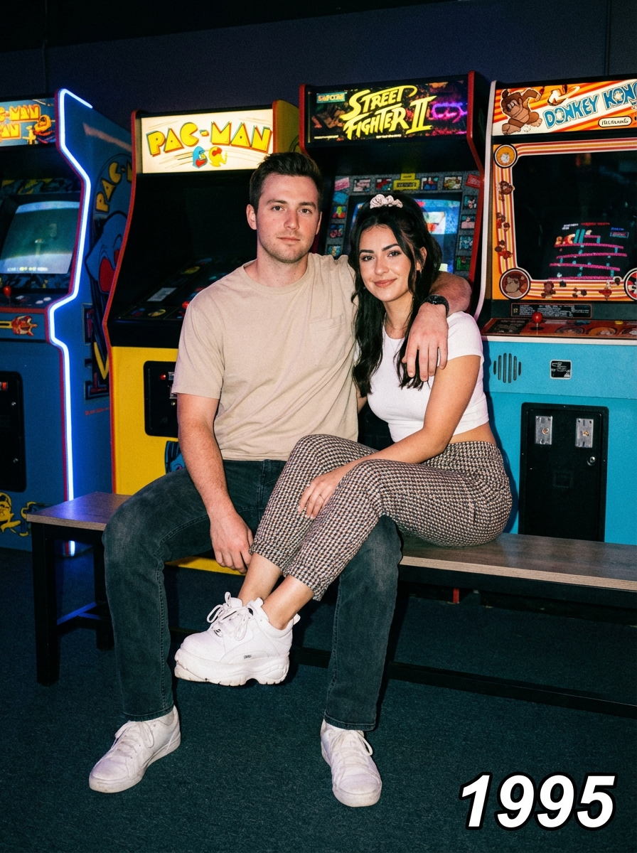 1995 couple in vintage 90s fashion - baggy jeans, crop top, chunky sneakers, scrunchie in hair , sitting together in a retro arcade with neon lights and classic video game machines, text overlay in bottom corner reading "1995" in white sans serif font with black outline