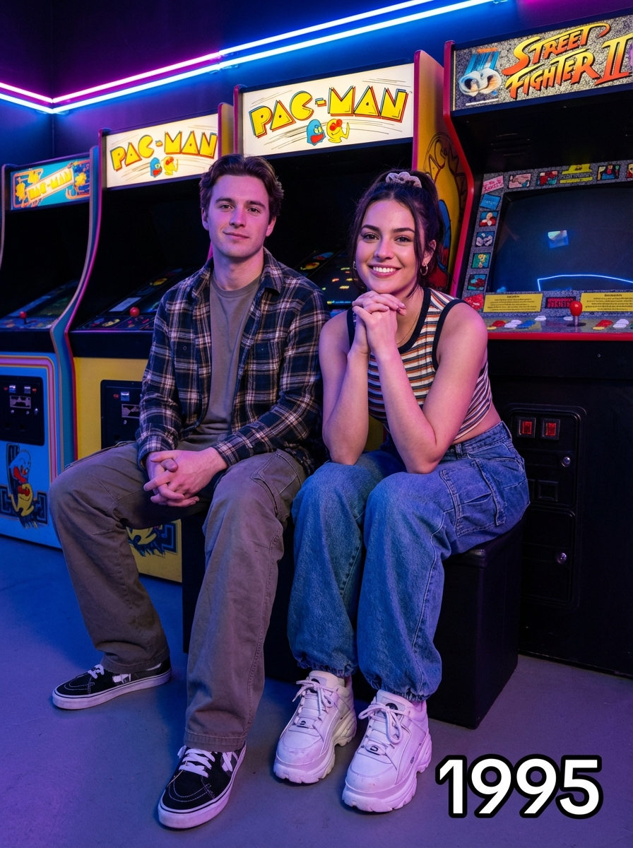 1995 couple in vintage 90s fashion - baggy jeans, crop top, chunky sneakers, scrunchie in hair , sitting together in a retro arcade with neon lights and classic video game machines, text overlay in bottom corner reading "1995" in white sans serif font with black outline