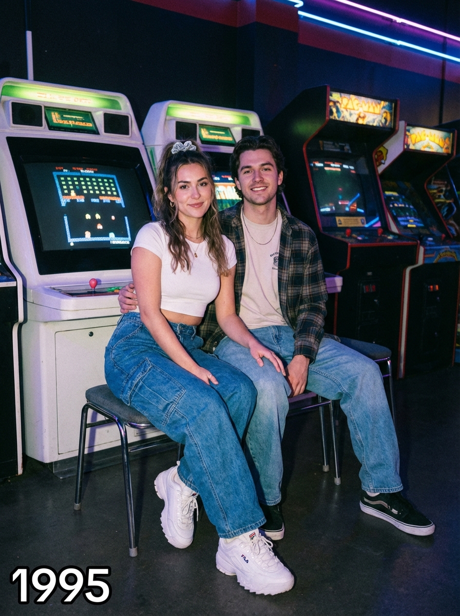 1995 couple in vintage 90s fashion - baggy jeans, crop top, chunky sneakers, scrunchie in hair , sitting together in a retro arcade with neon lights and classic video game machines, text overlay in bottom corner reading "1995" in white sans serif font with black outline