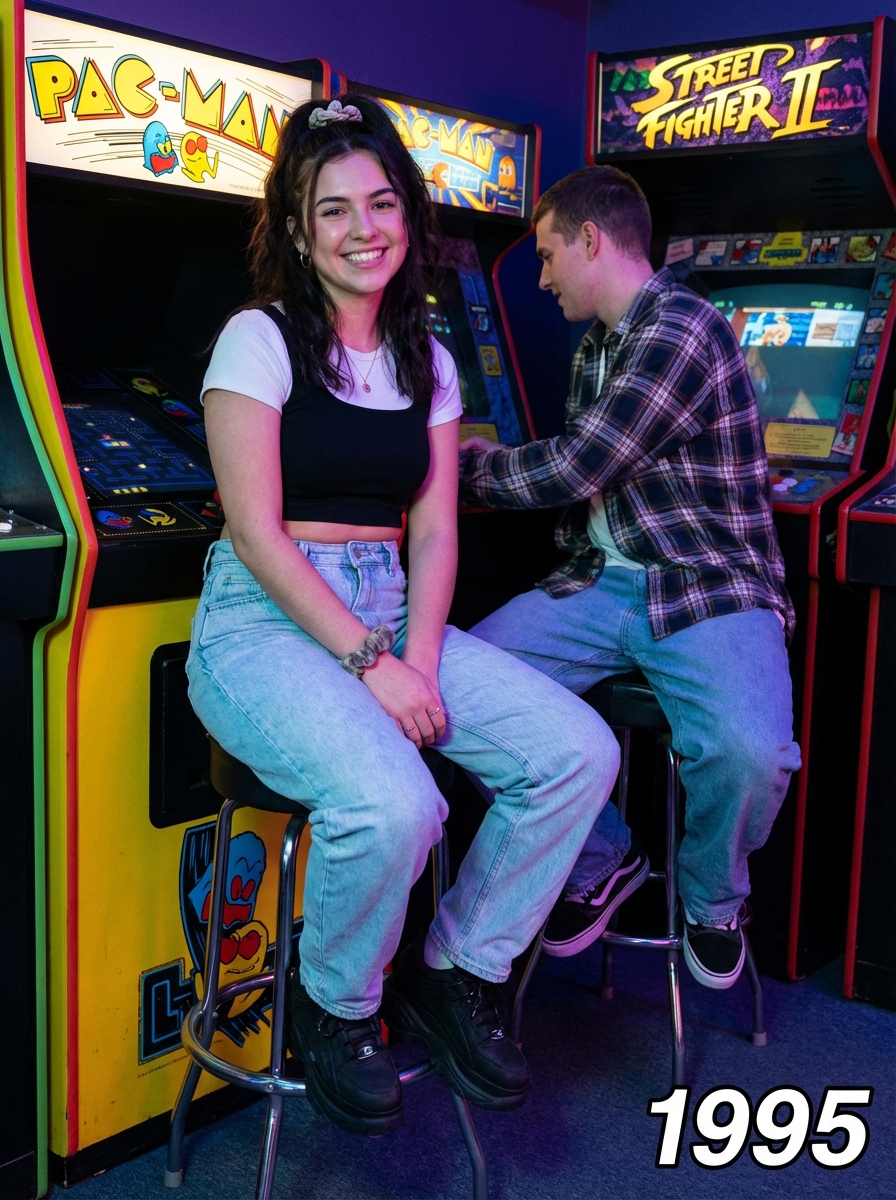 1995 couple in vintage 90s fashion - baggy jeans, crop top, chunky sneakers, scrunchie in hair , sitting together in a retro arcade with neon lights and classic video game machines, text overlay in bottom corner reading "1995" in white sans serif font with black outline