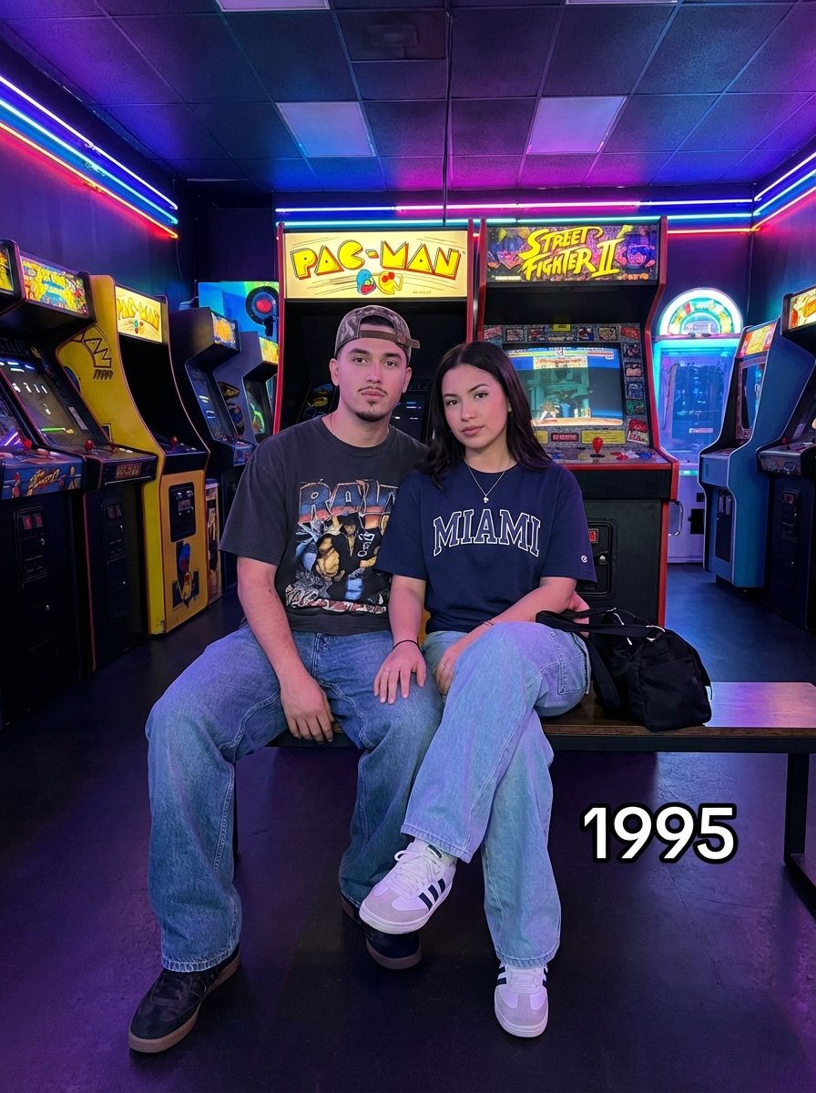 1995 couple in vintage 90s fashion - loose jeans, graphic t-shirt, backwards baseball cap, sitting together in a retro arcade with neon lights and classic video game machines, text overlay in bottom corner reading "1995" in white sans serif font with black outline