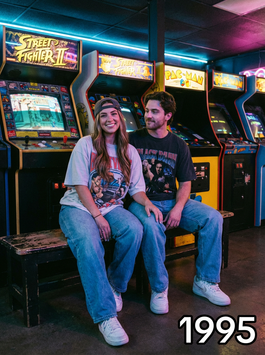 1995 couple in vintage 90s fashion - loose jeans, graphic t-shirt, backwards baseball cap, sitting together in a retro arcade with neon lights and classic video game machines, text overlay in bottom corner reading "1995" in white sans serif font with black outline