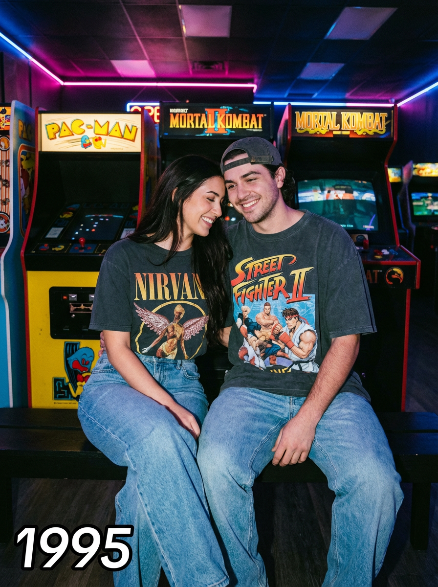 1995 couple in vintage 90s fashion - loose jeans, graphic t-shirt, backwards baseball cap, sitting together in a retro arcade with neon lights and classic video game machines, text overlay in bottom corner reading "1995" in white sans serif font with black outline