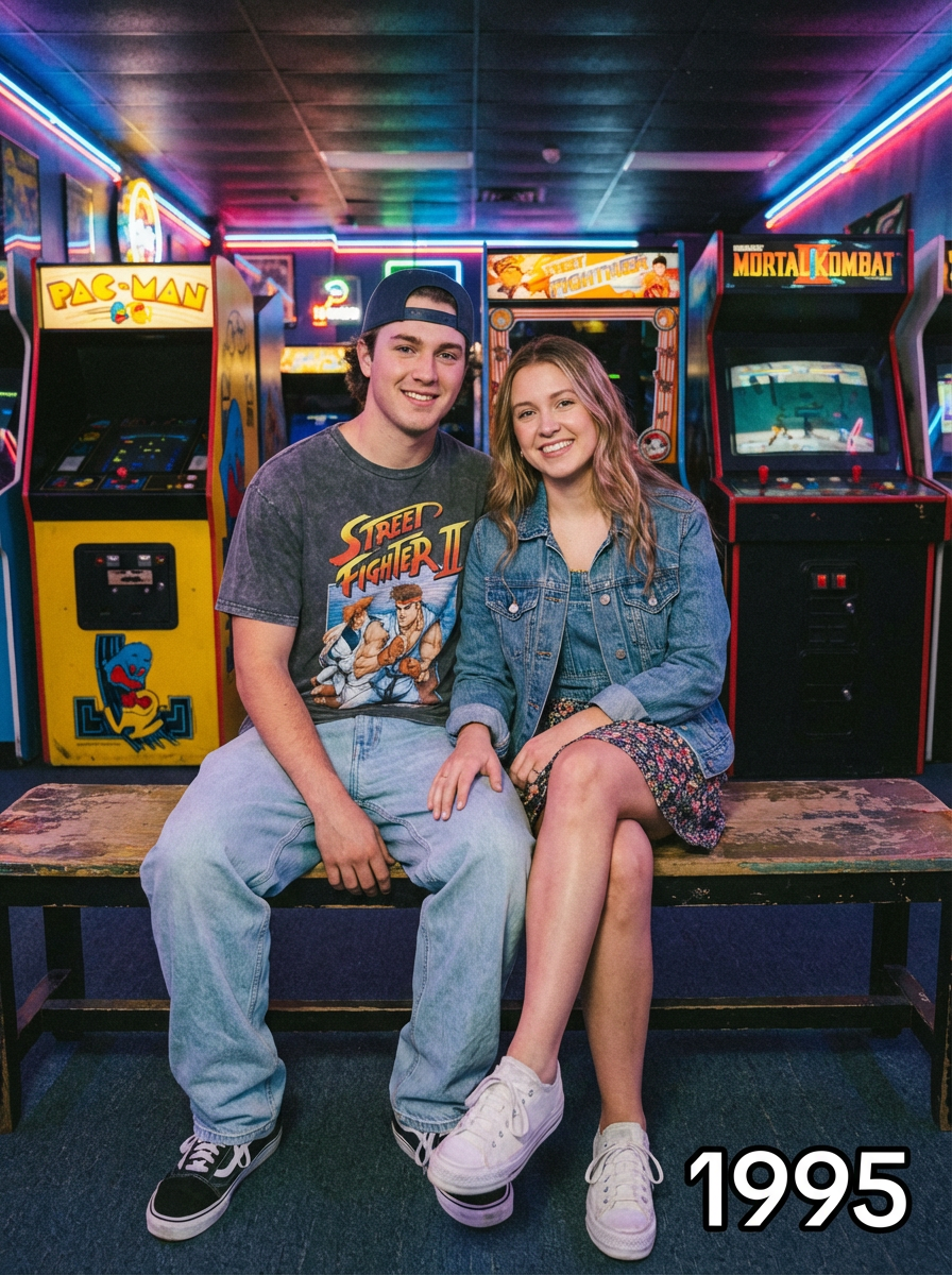 1995 couple in vintage 90s fashion - loose jeans, graphic t-shirt, backwards baseball cap, sitting together in a retro arcade with neon lights and classic video game machines, text overlay in bottom corner reading "1995" in white sans serif font with black outline