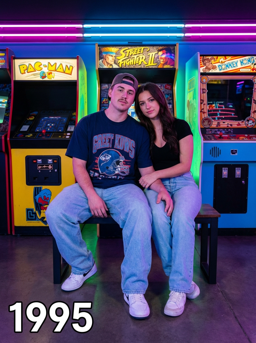 1995 couple in vintage 90s fashion - loose jeans, graphic t-shirt, backwards baseball cap, sitting together in a retro arcade with neon lights and classic video game machines, text overlay in bottom corner reading "1995" in white sans serif font with black outline