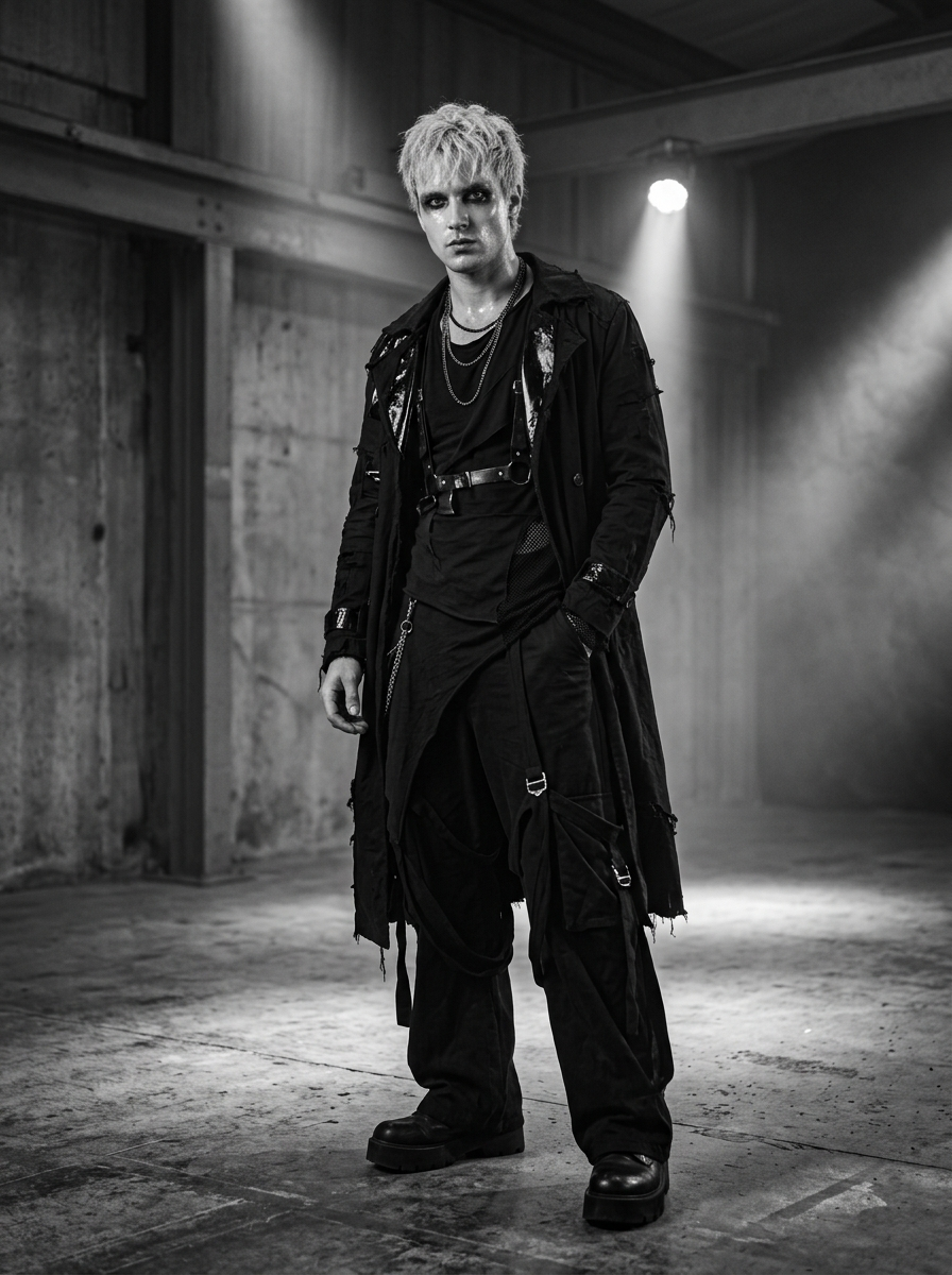 6. Edgy model in avant-garde fashion, mysterious gaze under harsh studio spotlights, directed chaotic energy, close-up with intense eye contact, dramatic high-contrast black and white, underground fashion mood, glossy skin, bold makeup, fashion editorial style, raw urban grit, volumetric rays, hyper-realistic, 8k.