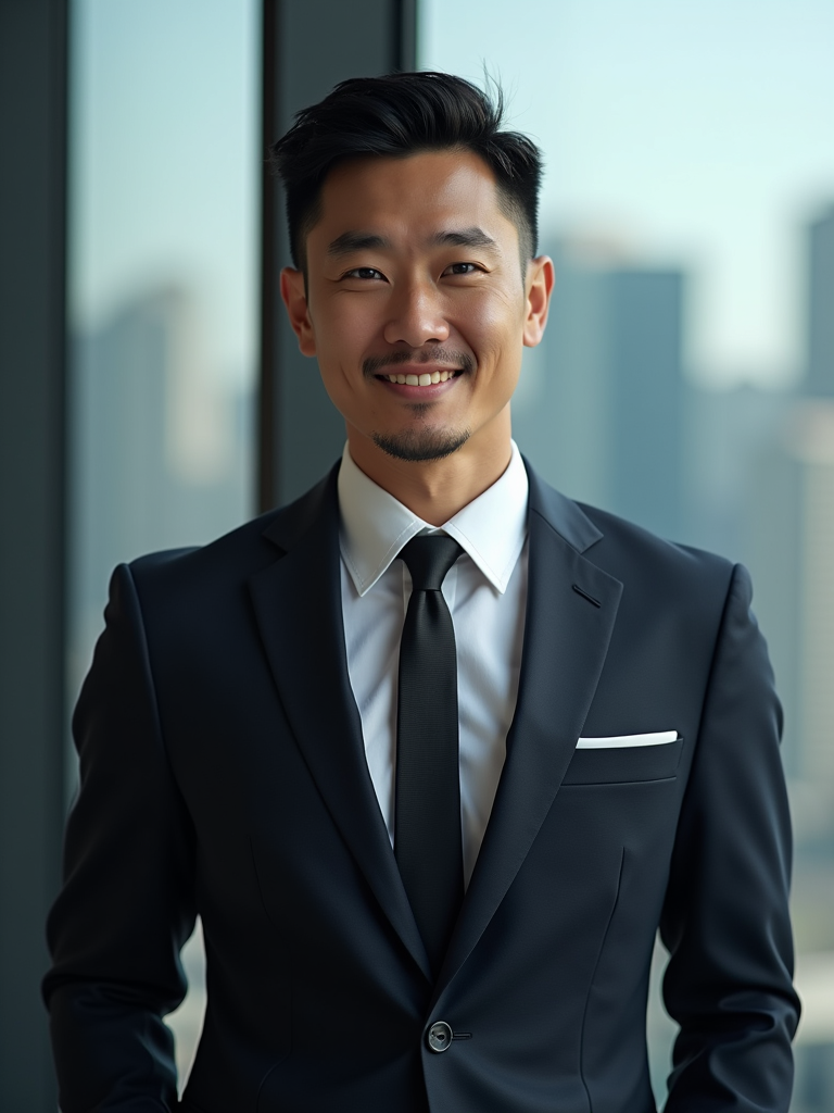 8k professional headshot of model as CEO, crisp details, premium studio backdrop, executive business attire, commanding posture, confident expression, high-definition, corner office setting, sharp focus, dramatic lighting, power suit, cityscape view