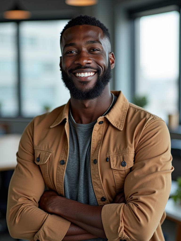 8k professional headshot of model, crisp details, bright modern office, casual tech wear, relaxed confident pose, approachable smile, high-definition, startup vibe, sharp focus, soft lighting, smart casual outfit, contemporary setting