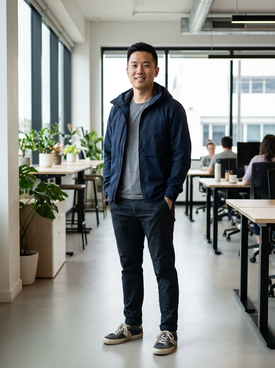 8k professional headshot of model, crisp details, bright modern office, casual tech wear, relaxed confident pose, approachable smile, high-definition, startup vibe, sharp focus, soft lighting, smart casual outfit, contemporary setting