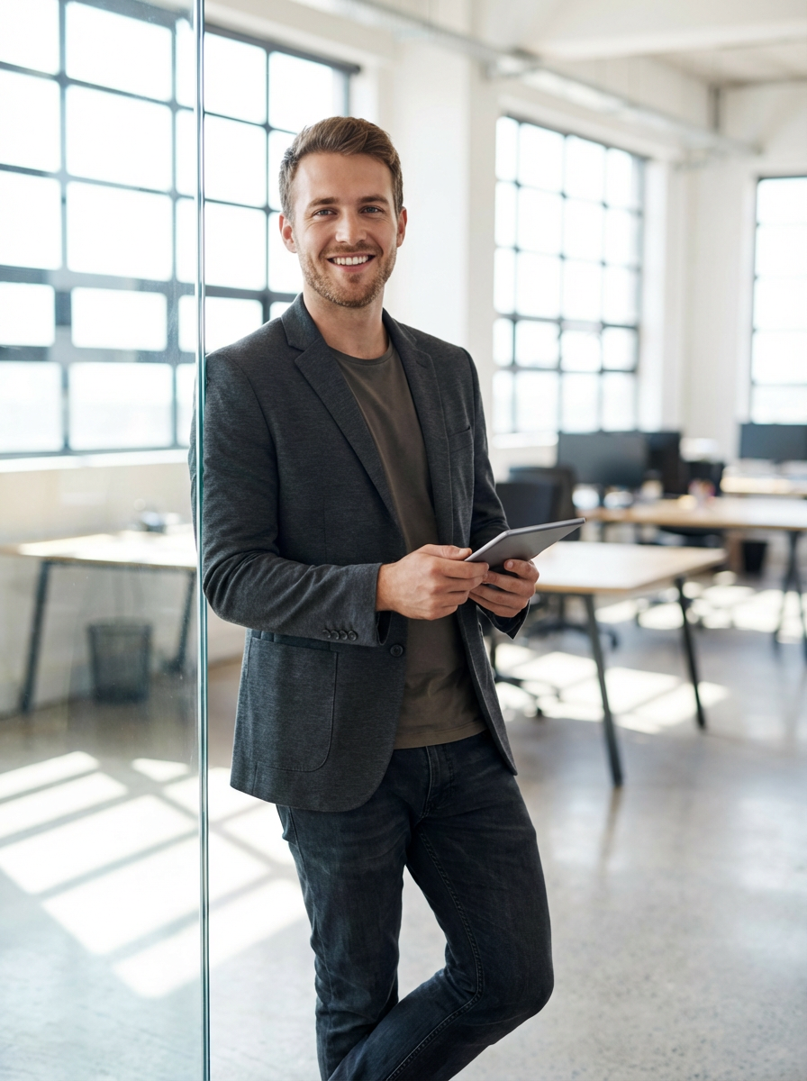 8k professional headshot of model, crisp details, bright modern office, casual tech wear, relaxed confident pose, approachable smile, high-definition, startup vibe, sharp focus, soft lighting, smart casual outfit, contemporary setting