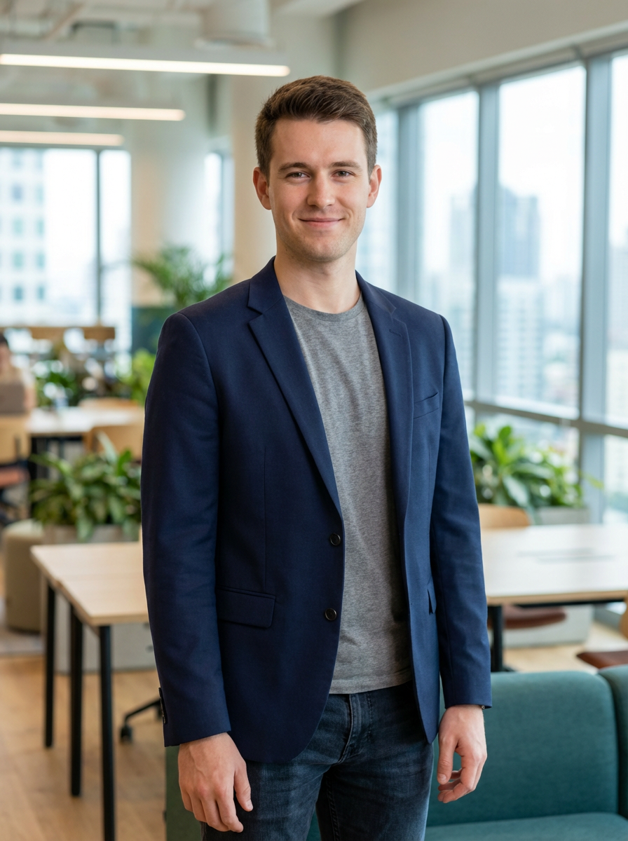 8k professional headshot of model, crisp details, bright modern office, casual tech wear, relaxed confident pose, approachable smile, high-definition, startup vibe, sharp focus, soft lighting, smart casual outfit, contemporary setting