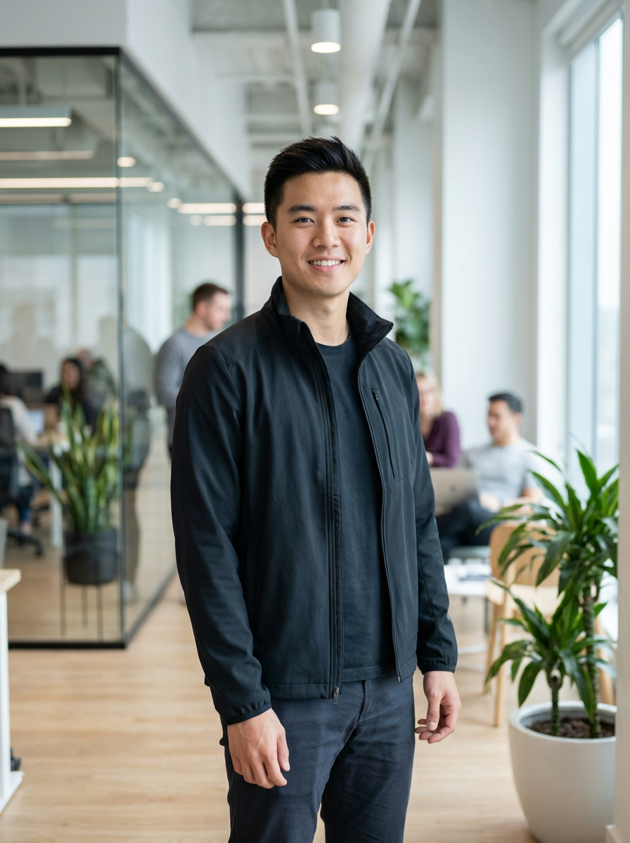 8k professional headshot of model, crisp details, bright modern office, casual tech wear, relaxed confident pose, approachable smile, high-definition, startup vibe, sharp focus, soft lighting, smart casual outfit, contemporary setting