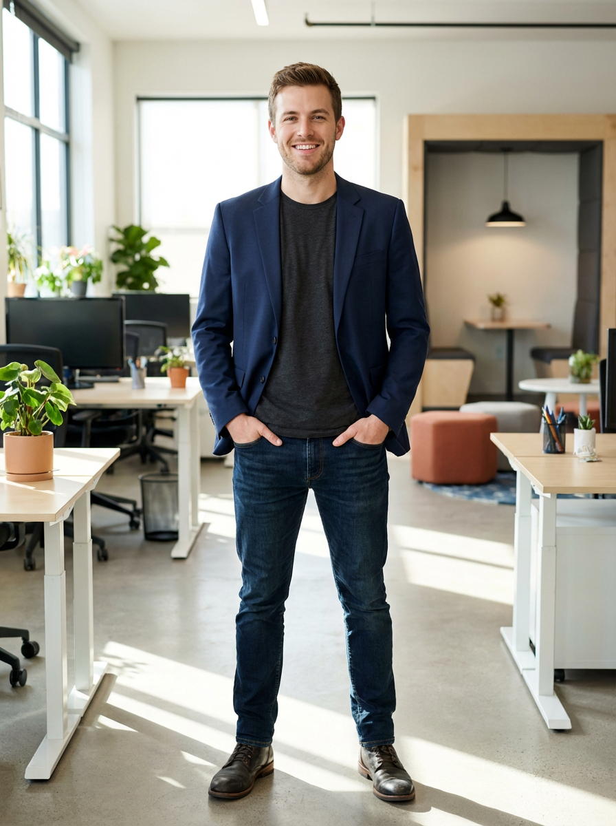 8k professional headshot of model, crisp details, casual smart attire, confident posture, friendly expression, high-definition, modern startup environment, sharp focus, natural lighting, business casual, open workspace background