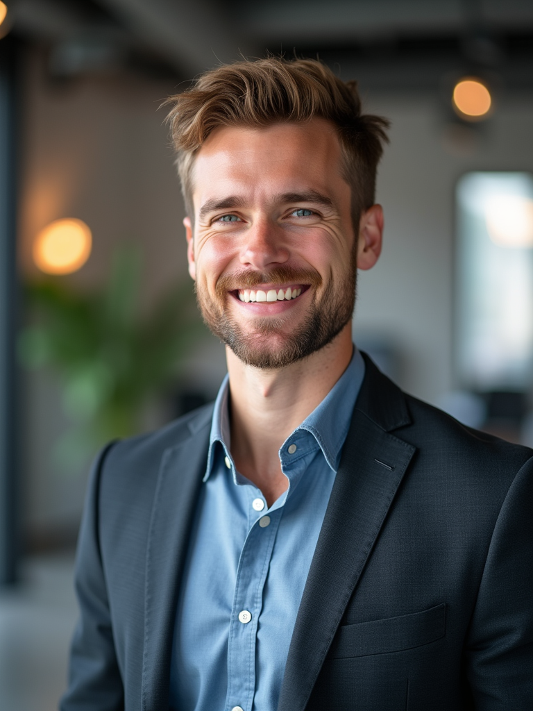 8k professional headshot of model, crisp details, studio backdrop, casual smart attire, confident posture, friendly expression, high-definition, modern startup environment, sharp focus, natural lighting, business casual, open workspace background