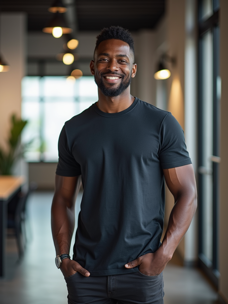 8k professional headshot of model, crisp details, studio backdrop, casual smart attire, confident posture, friendly expression, high-definition, modern startup environment, sharp focus, natural lighting, business casual, open workspace background
