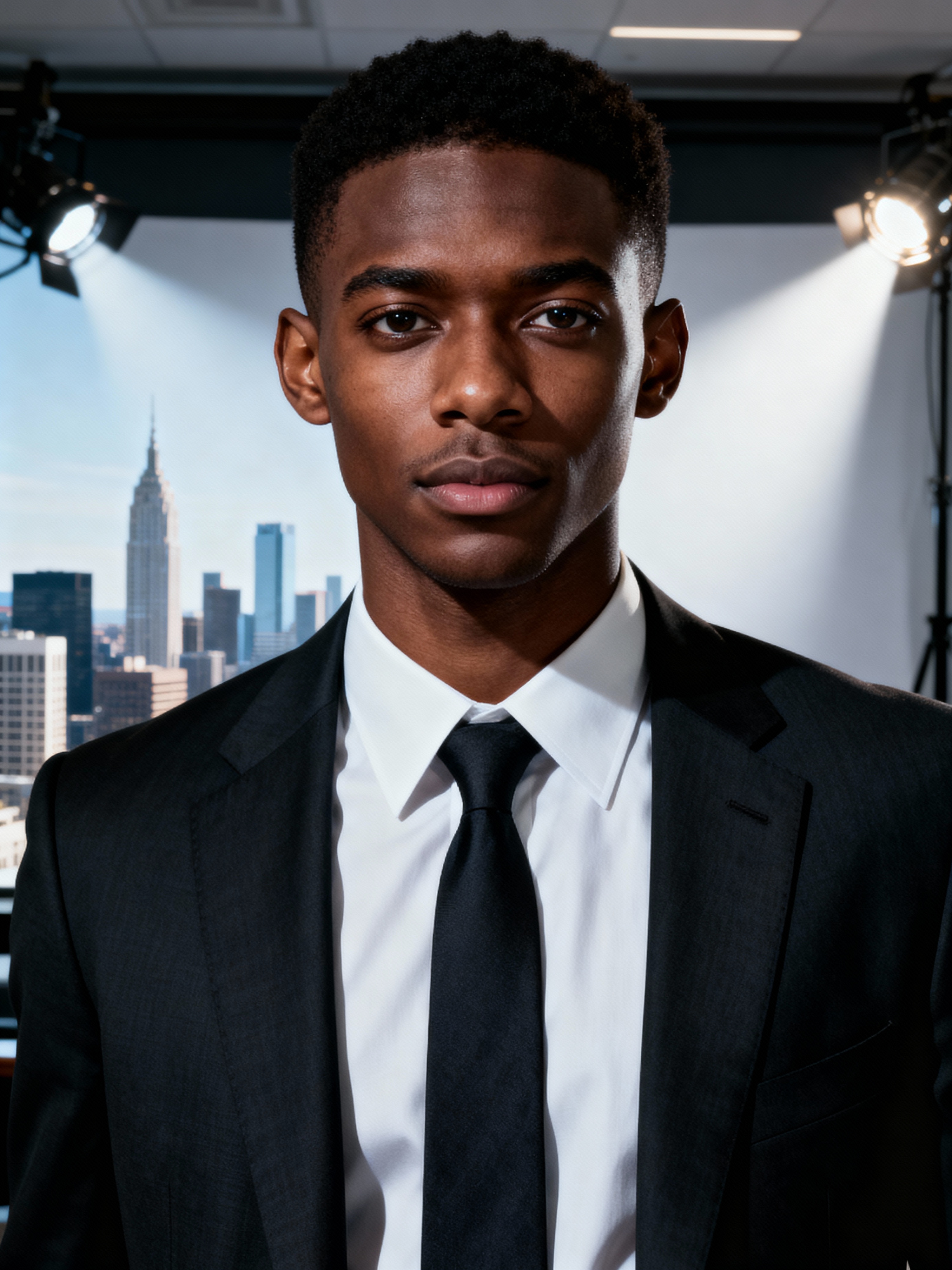 8k professional headshot of model, crisp details, studio backdrop, executive attire, confident posture, neutral expression, high-definition, corporate setting, sharp focus, ambient lighting, business professional, cityscape view