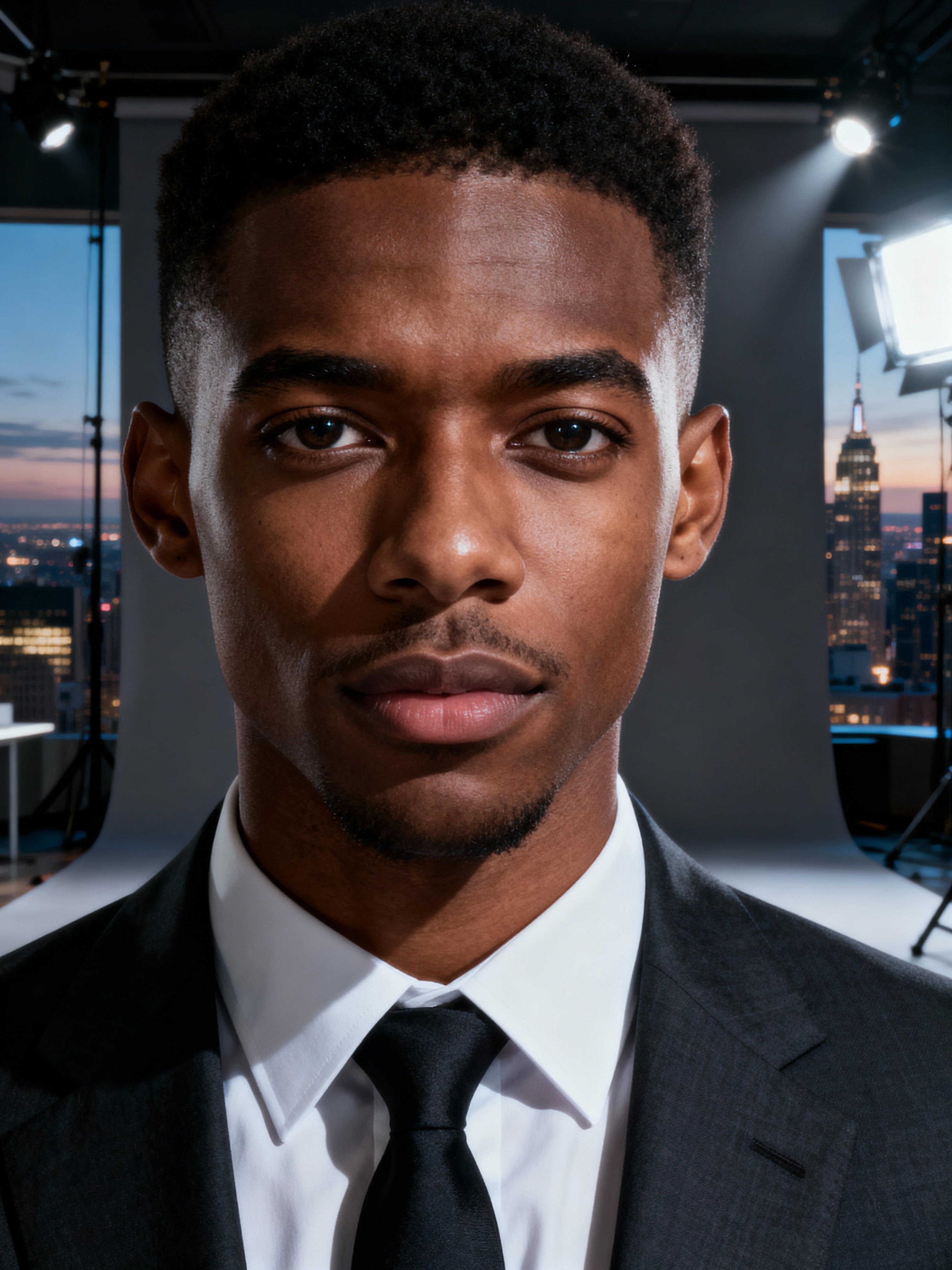 8k professional headshot of model, crisp details, studio backdrop, executive attire, confident posture, neutral expression, high-definition, corporate setting, sharp focus, ambient lighting, business professional, cityscape view
