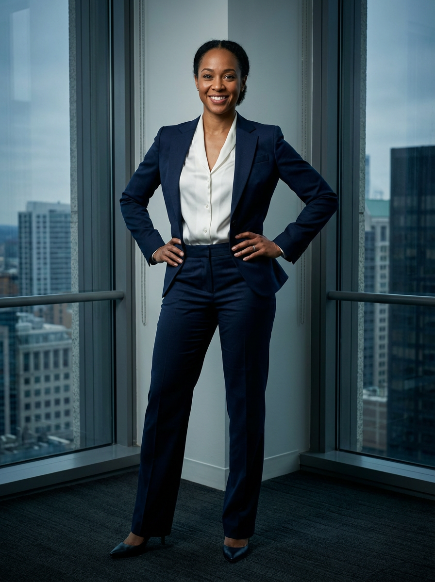 8k professional headshot of model as CEO, crisp details, premium executive business attire, commanding posture, confident expression, high-definition, corner office setting, sharp focus, dramatic lighting, power suit
