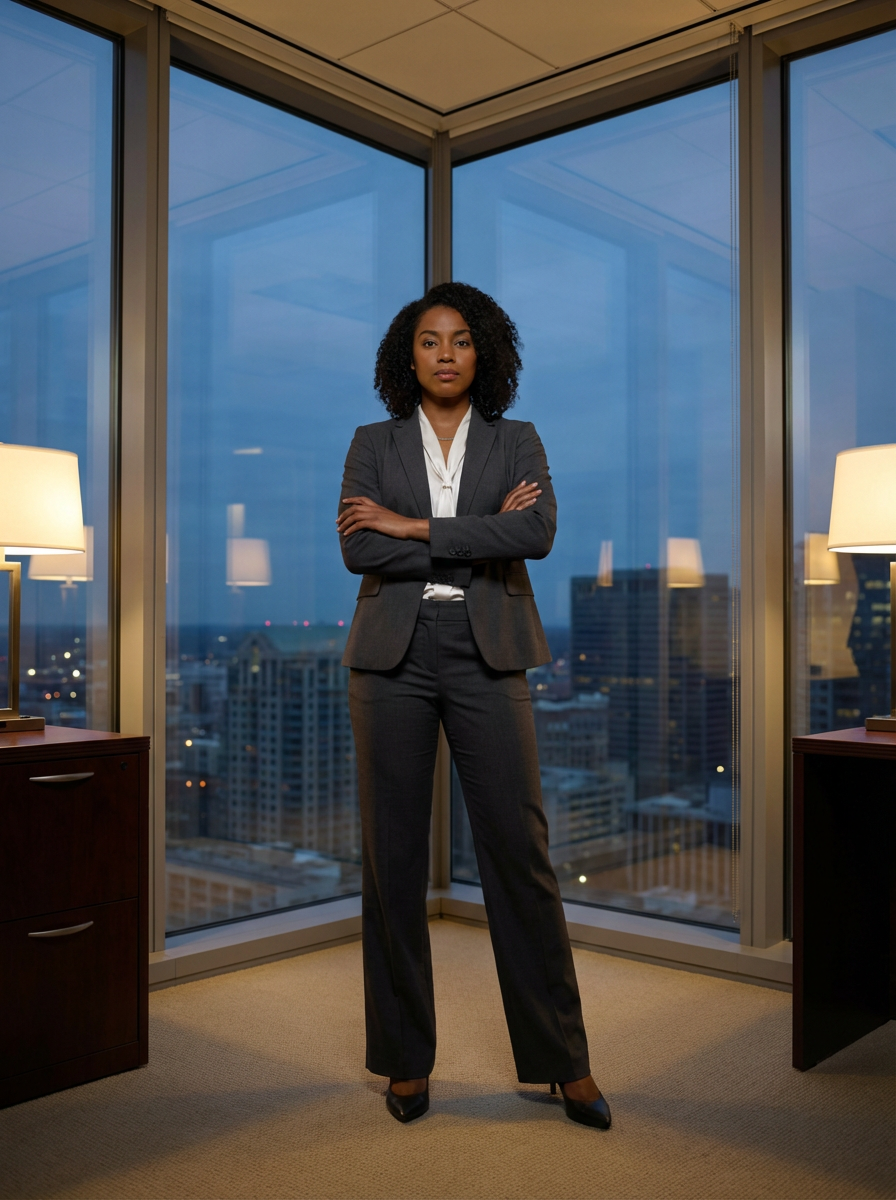 8k professional headshot of model as CEO, crisp details, premium executive business attire, commanding posture, confident expression, high-definition, corner office setting, sharp focus, dramatic lighting, power suit