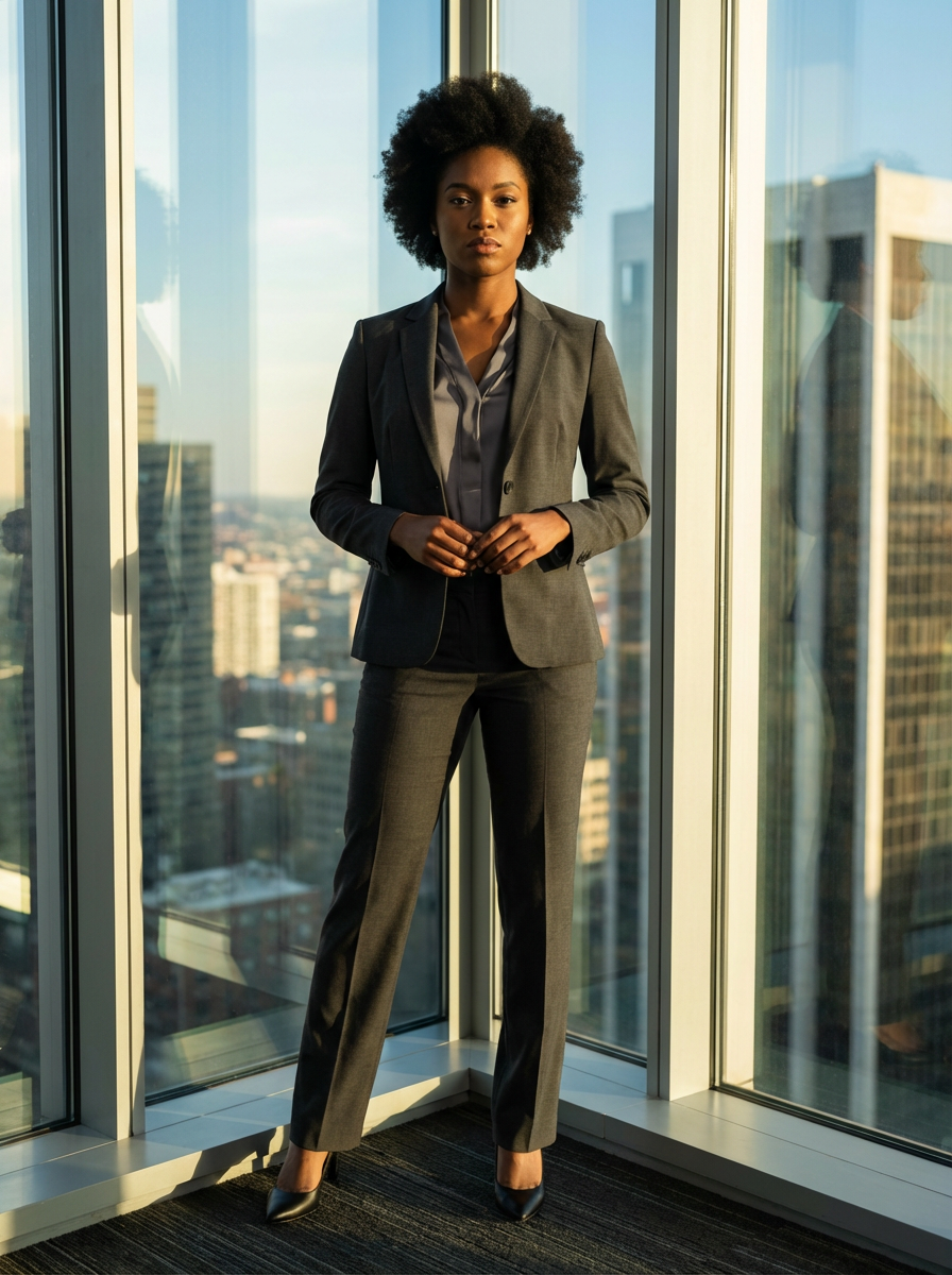 8k professional headshot of model as CEO, crisp details, premium executive business attire, commanding posture, confident expression, high-definition, corner office setting, sharp focus, dramatic lighting, power suit