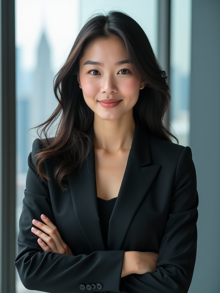 8k professional headshot of model as CEO, crisp details, premium studio backdrop, executive business attire, commanding posture, confident expression, high-definition, corner office setting, sharp focus, dramatic lighting, power suit, cityscape view